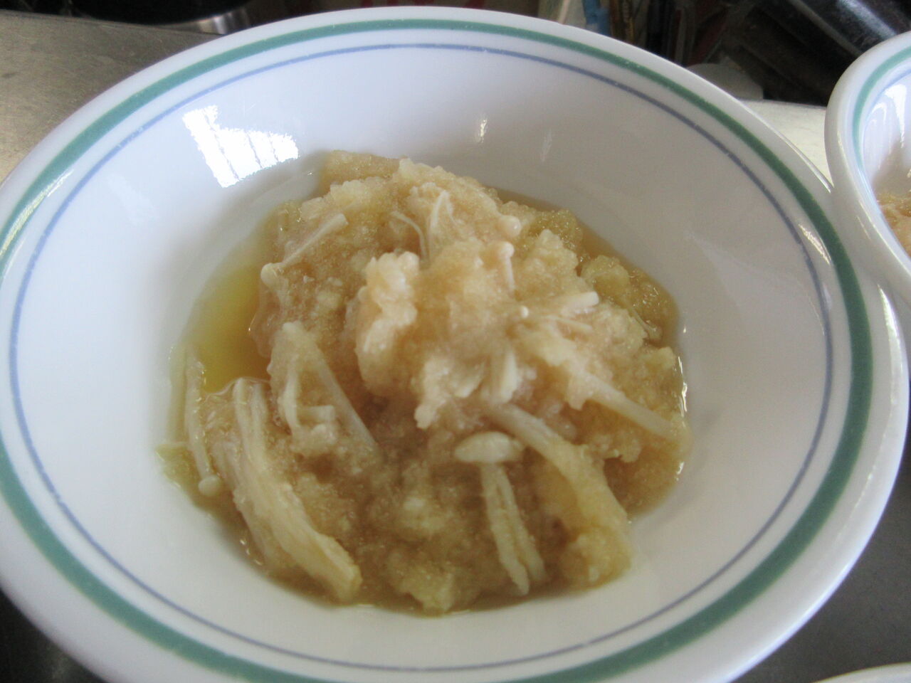 茹でたエノキを大根おろしで和え、追いカツオつゆで味付けしました。