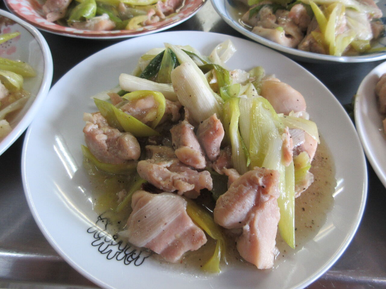 大量の長ネギと鶏もも肉、ニンニク、ショウガを炒め合わせ塩コショウで味付けしています。染み出た汁は片栗でとじました。