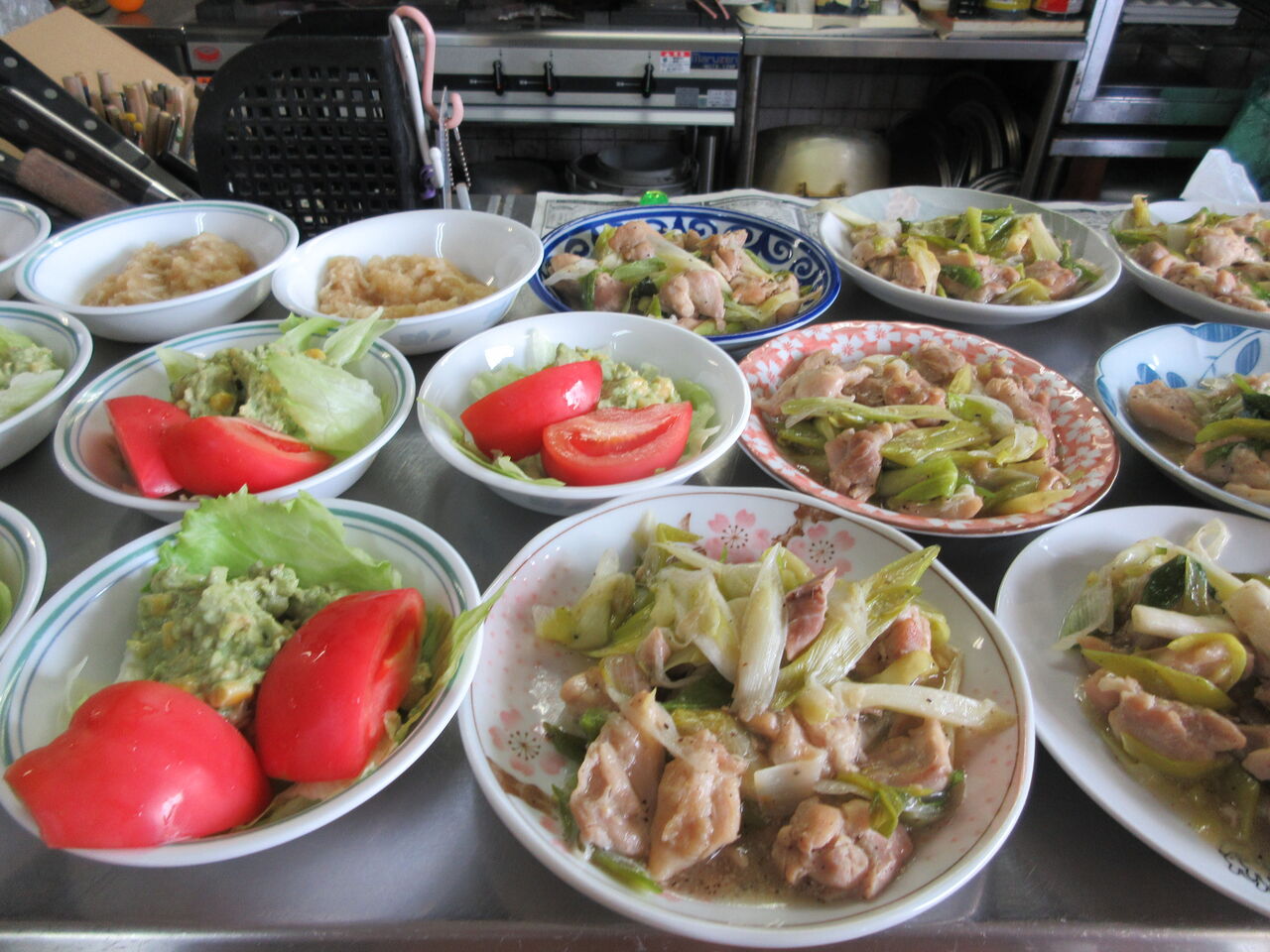 今日のカウンター上です。右には炒め物のお代わりが、左にはおろし和えのお代わり用が出してあります。