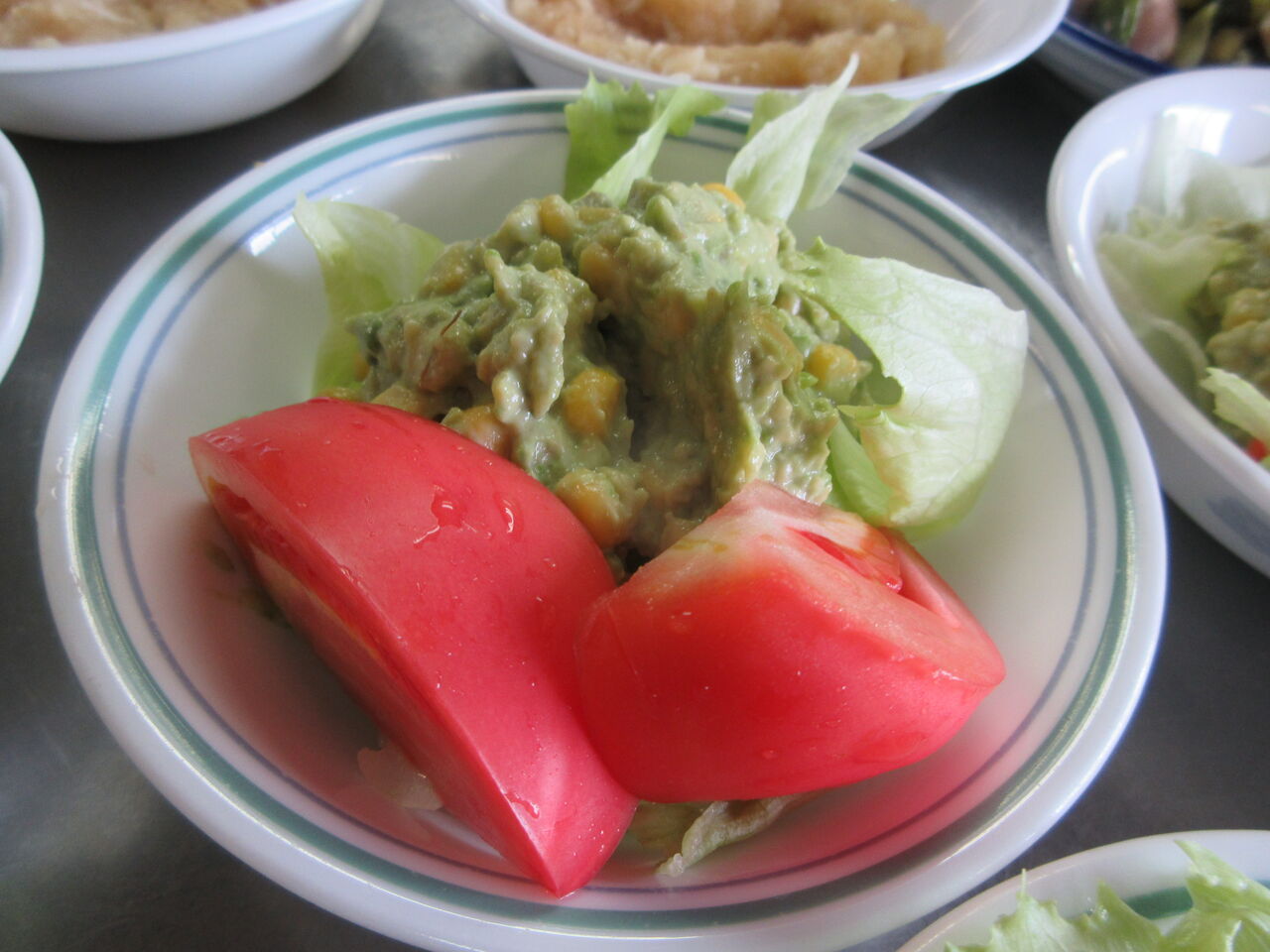 アボカドをつぶしてコーンとマヨネーズを混ぜ込み、レタスを敷いてトマトを添えたサラダにしました。