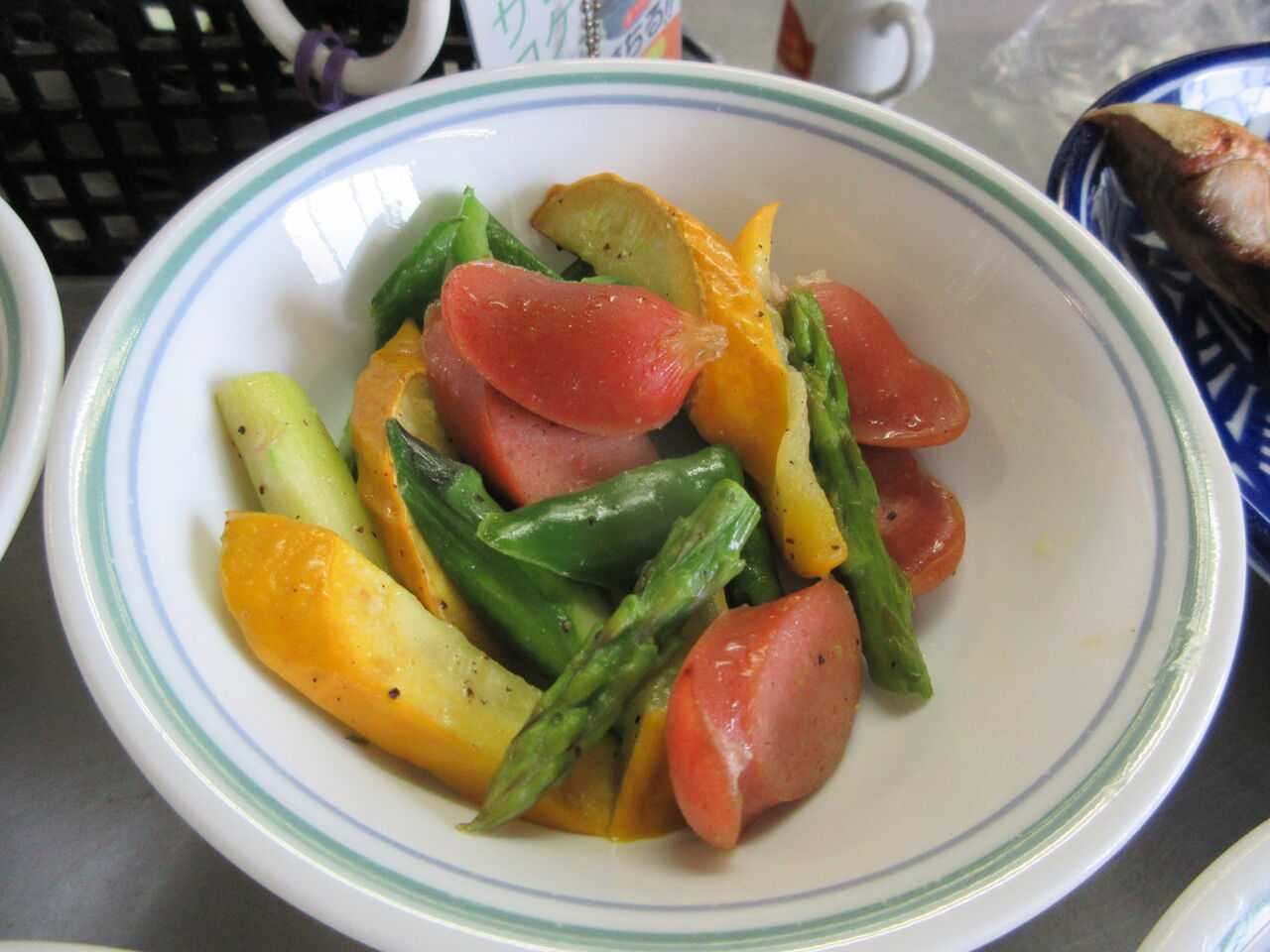 アスパラとズッキーニ、ピーマン、ソーセージをマーガリンで炒め塩コショウしています。