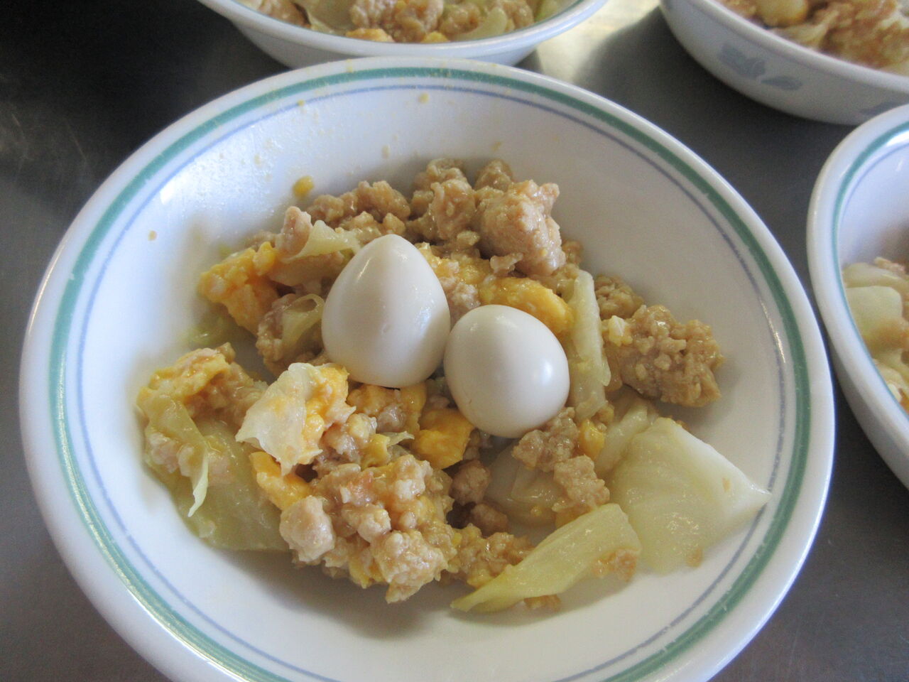 昨日の三食盛りを混ぜ合わせ、ウズラ卵を飾って巣ごもり風にしています。