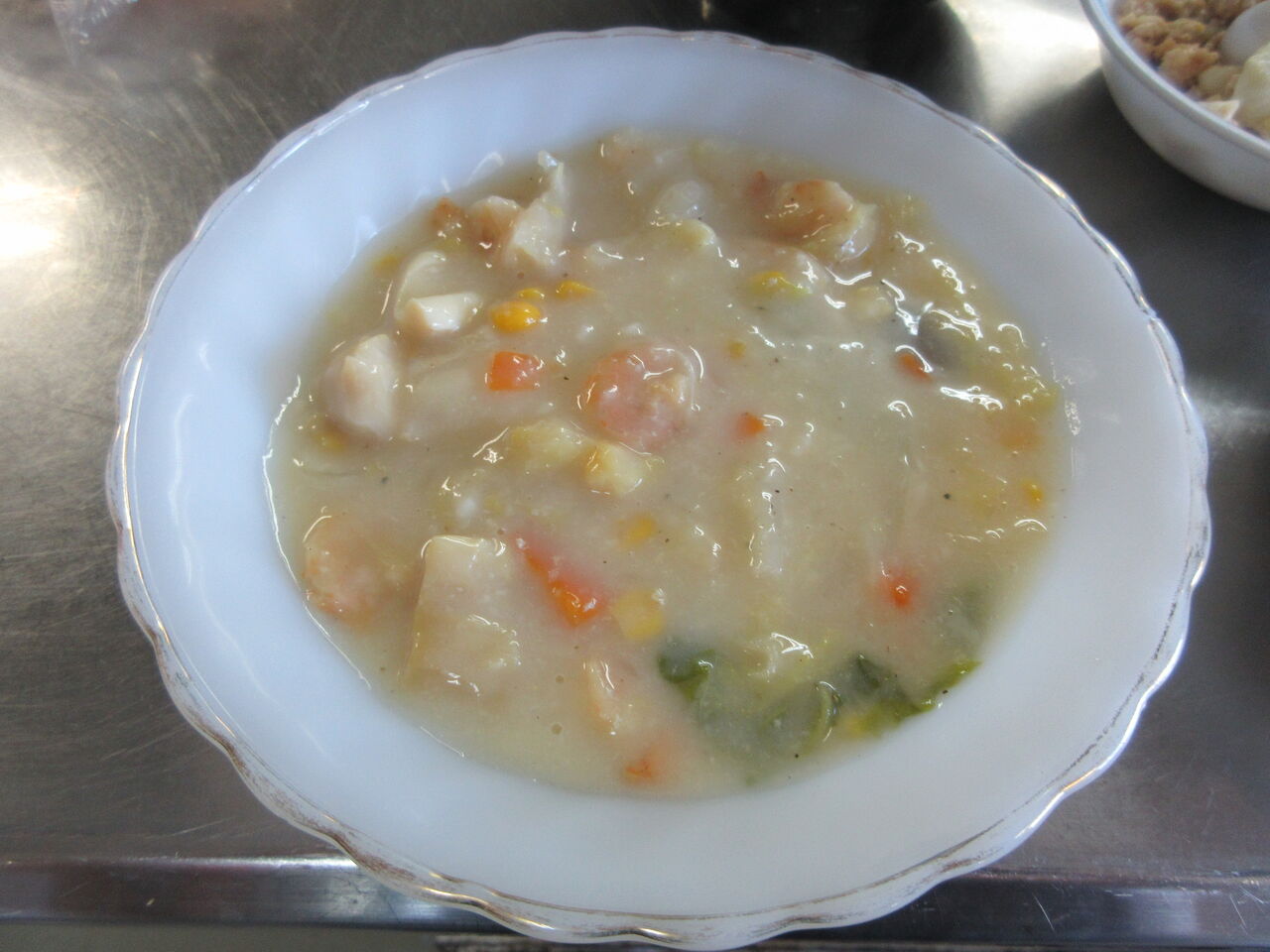 シーフードシチューは白菜と玉ねぎ、人参、コーン、ホタテ、エビ、イカで作りました。いいだしが出ています。