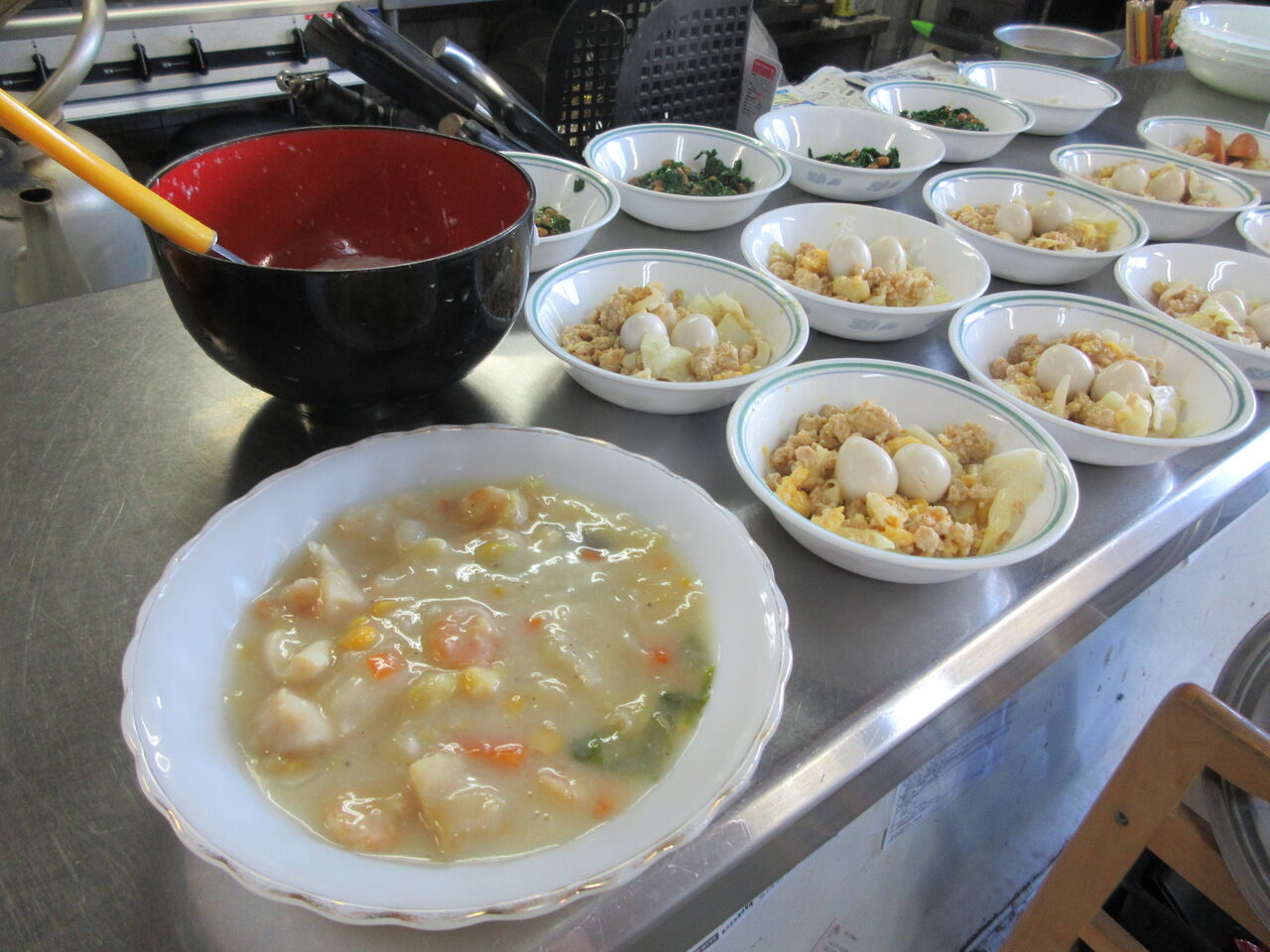今日のカウンター上です。シチューは加温プレートで温めてあります。副菜のお代わり用はとろろになっています。