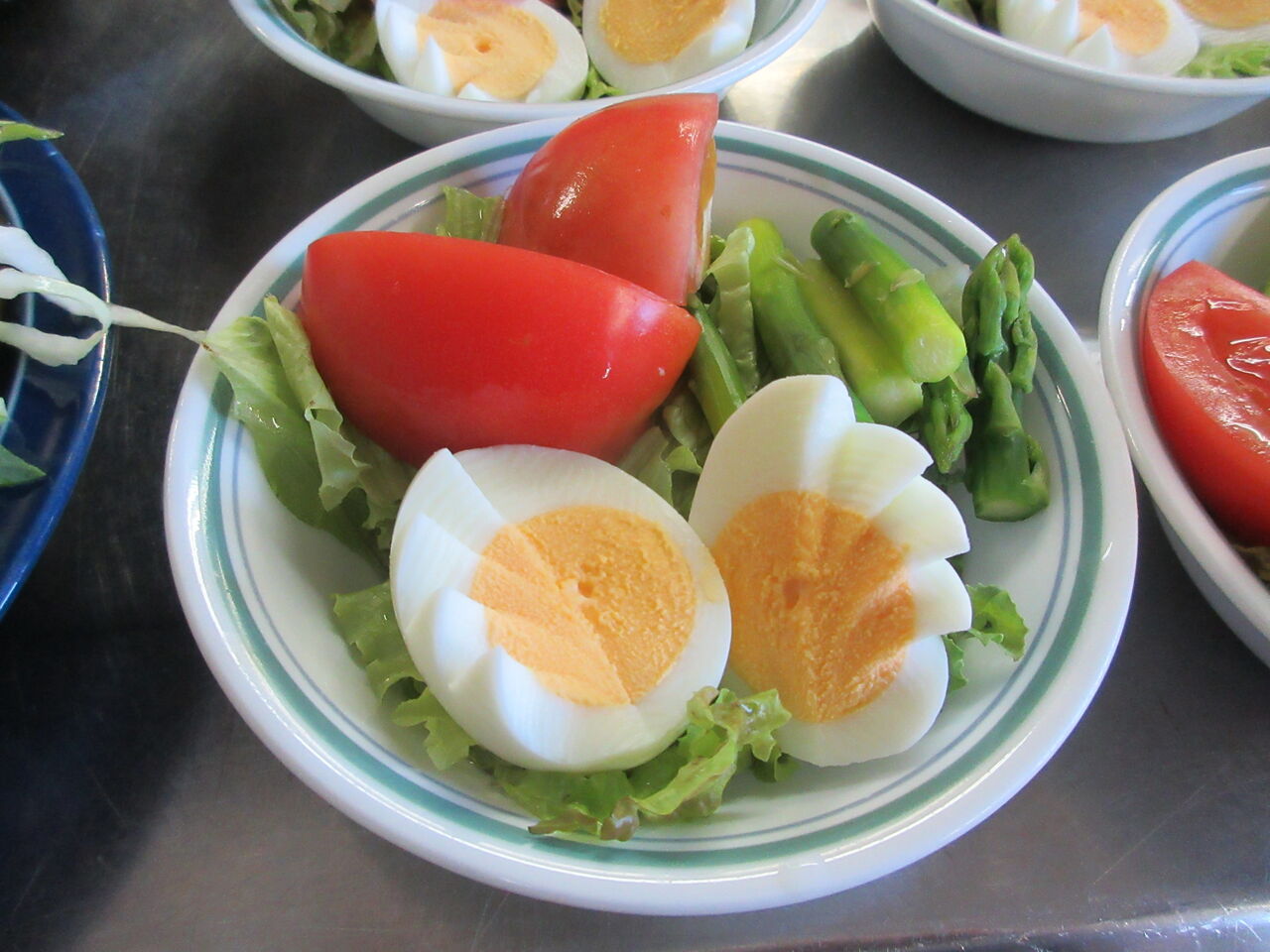 副菜のサラダはレタス、茹で卵、アスパラ、トマトかオレンジなどで作っています。