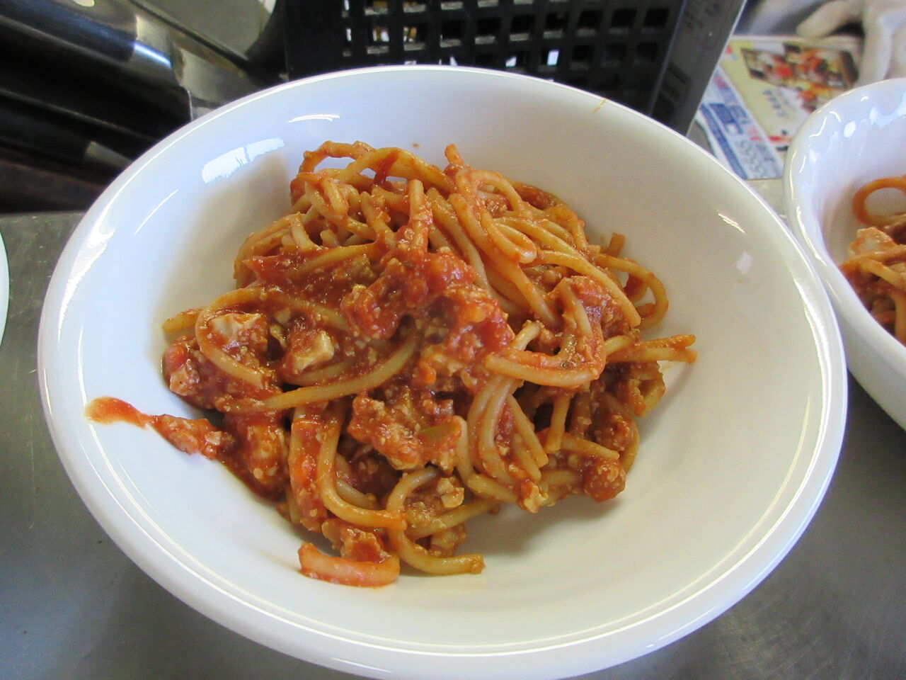 今日のカウンター上です。カレーは加温プレートで温めてあります。副菜のお代わり用はスパゲティです。