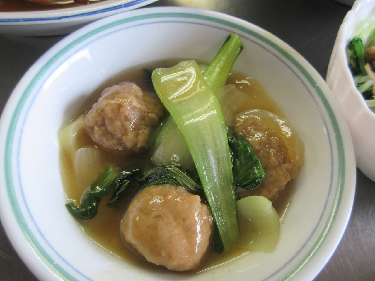 10月25日土曜日、今日のお昼御飯です。主菜は「かに玉風卵」副菜は「肉団子と青梗菜のあんかけ」と「水菜のおひたし」のどちらかです。汁物はスープになりました。