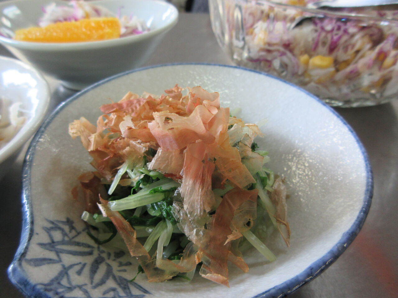 水菜のおひたしはツナ嫌いの人に副菜として渡しています。花かつおかけました。