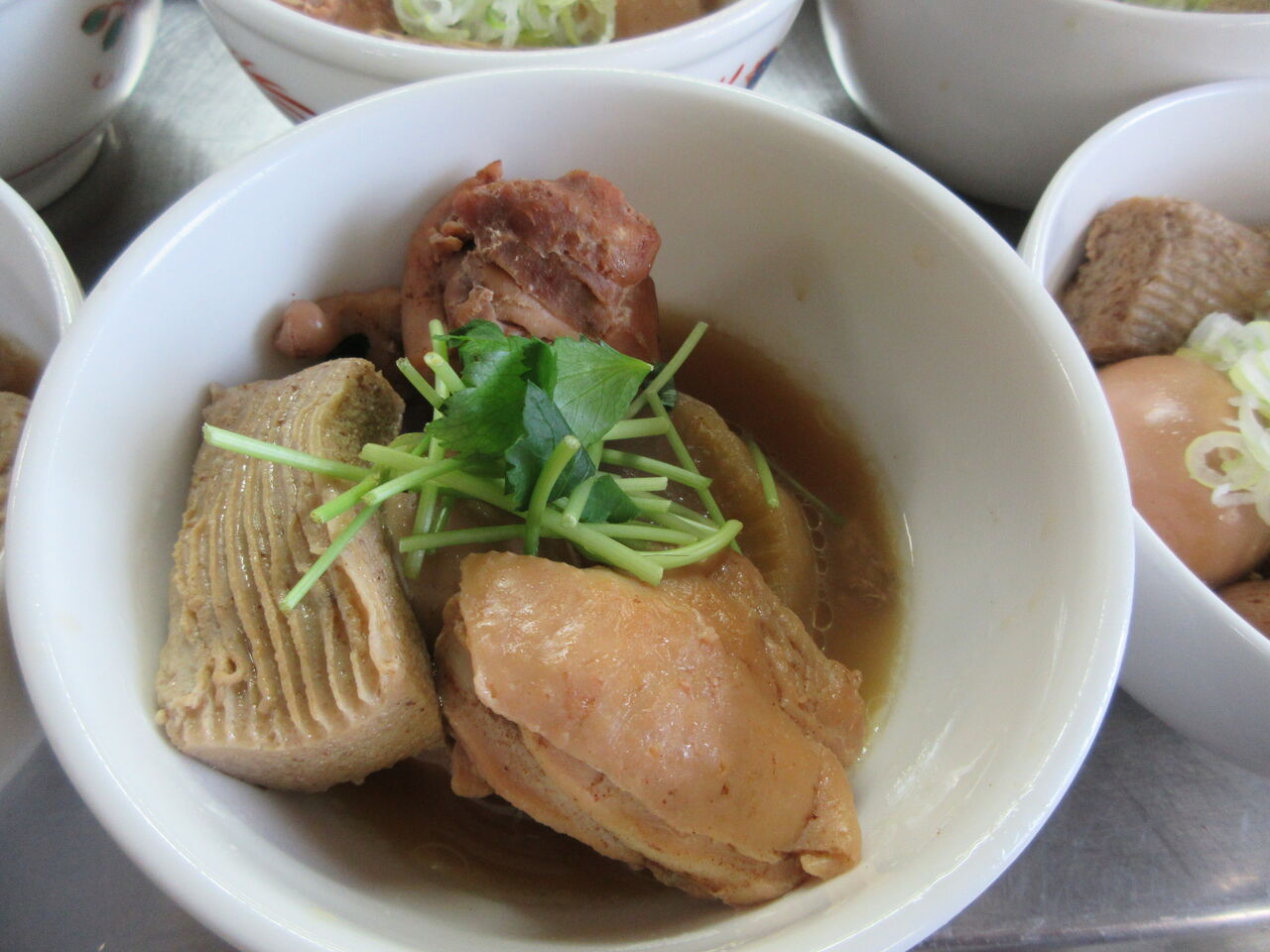 煮物は大根が数本上がってきたので作りました。大根、卵、鶏モモ、すだれ麩か高野豆腐を盛り合わせ、刻んだ三つ葉かネギをトッピングしてあります。