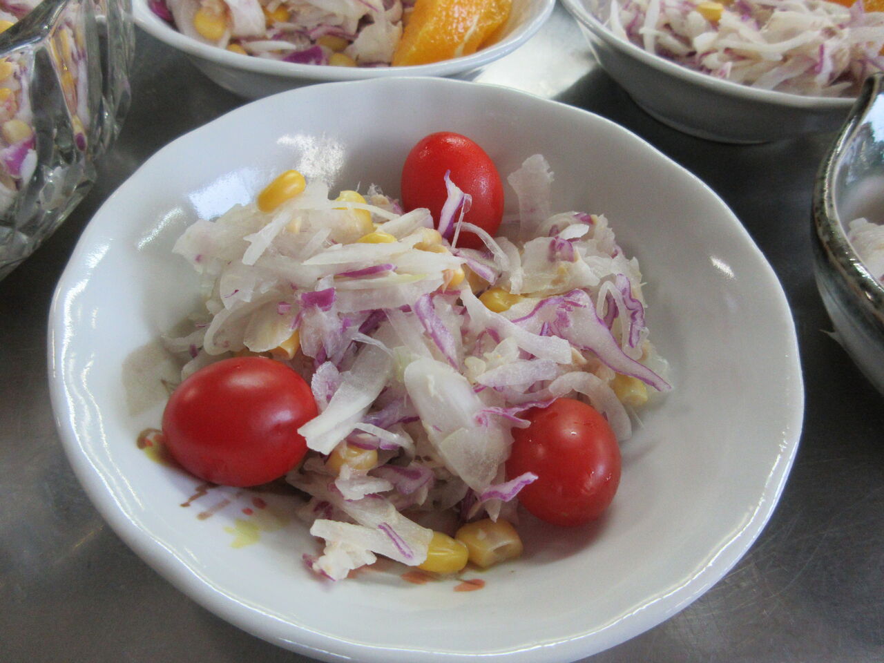 溜まっていたむき玉ねぎと紫キャベツをフードプロセッサーで薄切りにして水にさらし、脱水してツナとコーンを混ぜマヨネーズで味付けしました。ミニトマトかオレンジを飾りました。