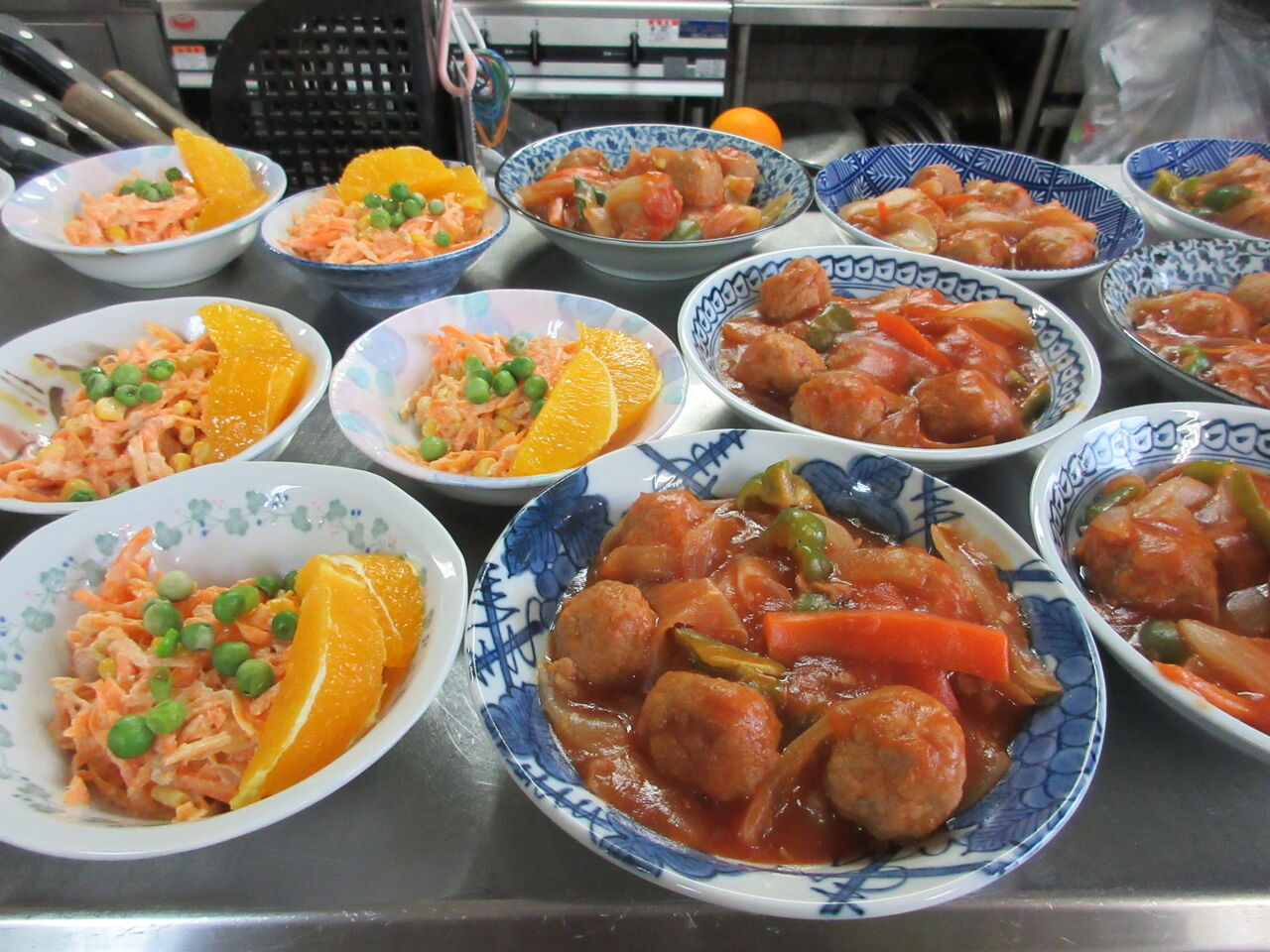 今日のカウンター上です。右には酢豚風のお代わりが、左にはにんじんサラダのお代わり用が出してあります。