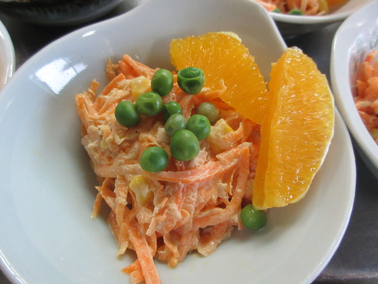 大量にたまった人参をフードプロセッサーで千切りにして、ツナとコーン、マヨネーズでサラダを作り盛り付けた後グリンピースをトッピングしオレンジを添えました。