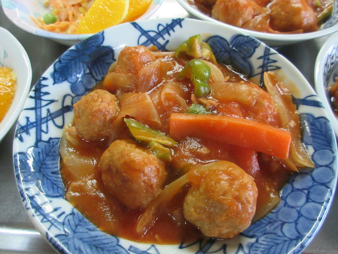 10月31日金曜日、今日のお昼御飯です。主菜は「肉団子の酢豚風」副菜は「春雨サラダ」「人参のツナサラダ」のどちらかです。汁物は「エノキと卵の味噌汁」になりました。