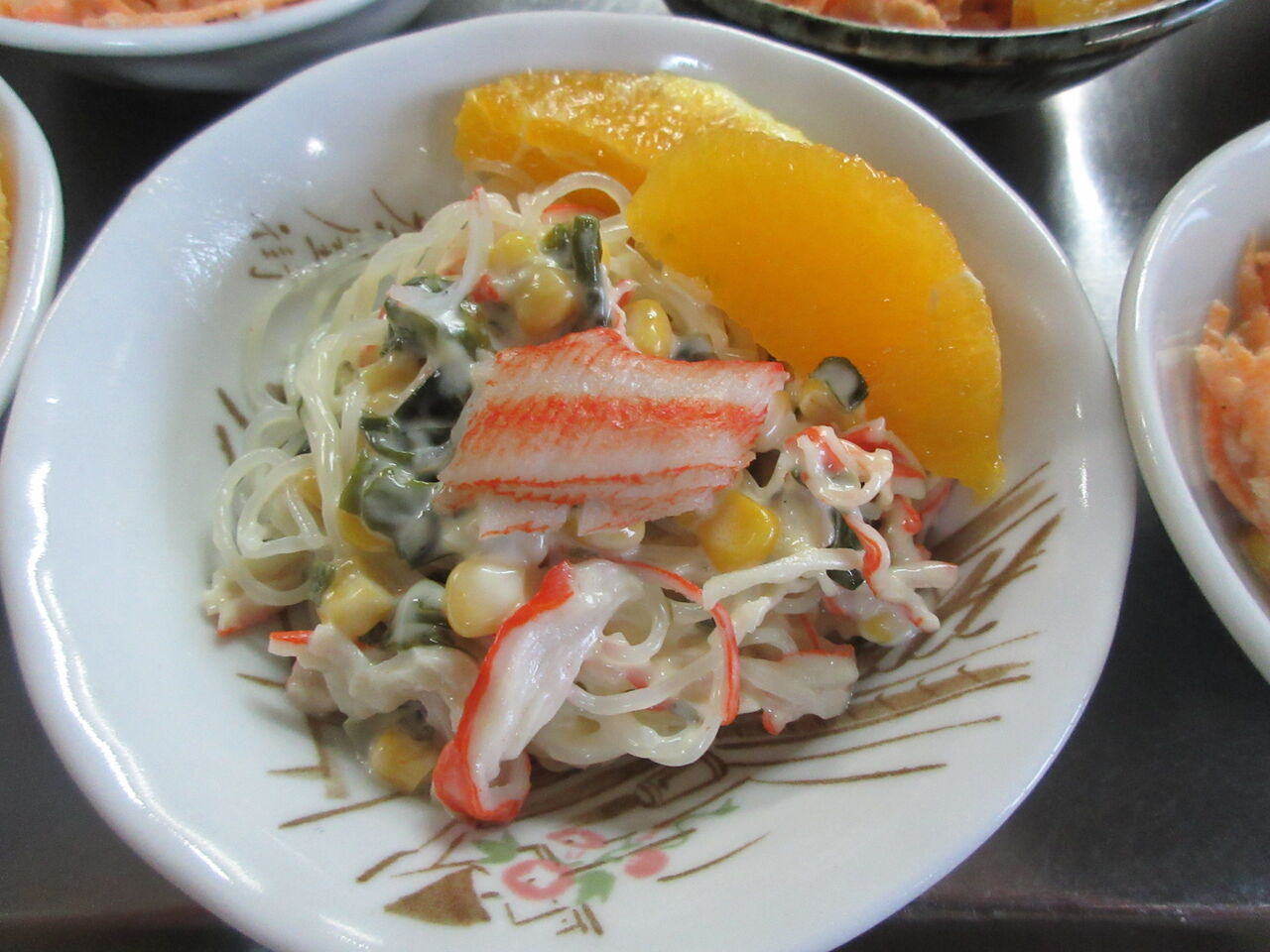 昨日の春雨サラダが残っていたのでカニ足かまぼこマシマシでリメイクしました。オレンジ添えています。