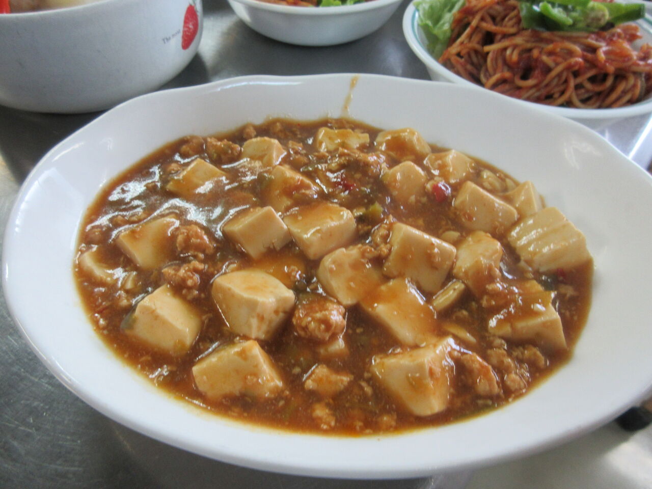 今日のカウンター上です。麻婆豆腐は加温プレート上で温められており、副菜として作ったもののキャンセルがあって不要になった蕪と肉団子の煮物が副菜のお代わり用として出してあります。