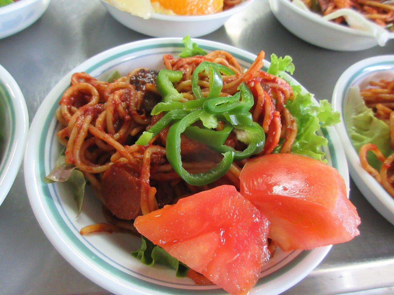 休み前に作ったスパゲティですが今朝の朝食にほとんど食べに来る人がいなかったため結構残っています。これをリメイクしてレタスを敷き盛りつけ、茹でたピーマンとトマトかオレンジなどを添えました。