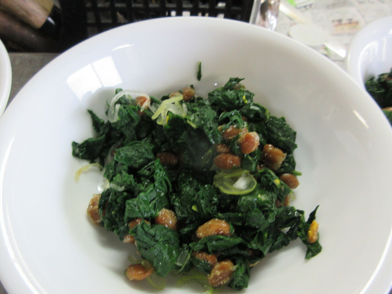 茹でた蕪の葉に納豆と刻みネギを加え追いカツオつゆで味付けしました。