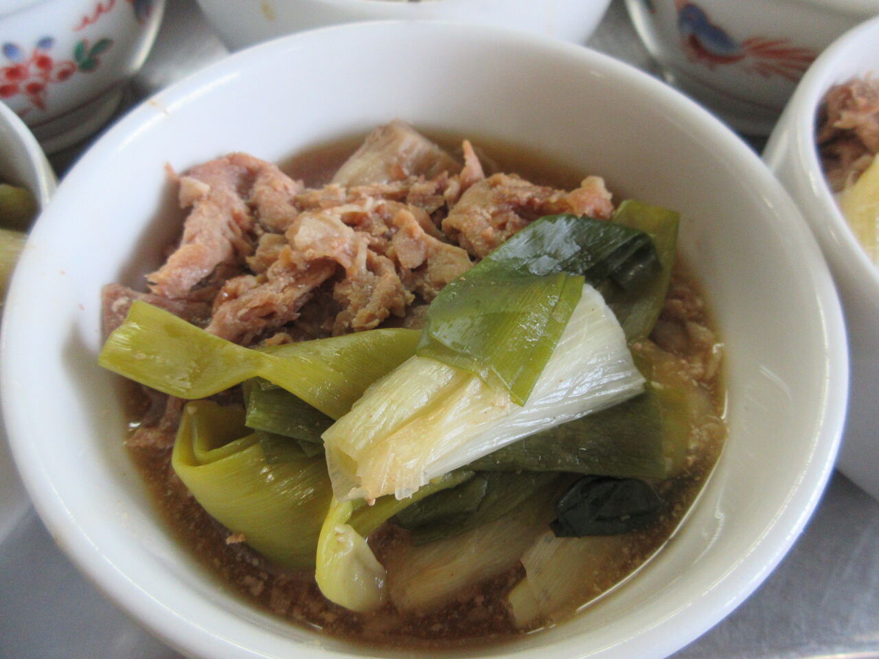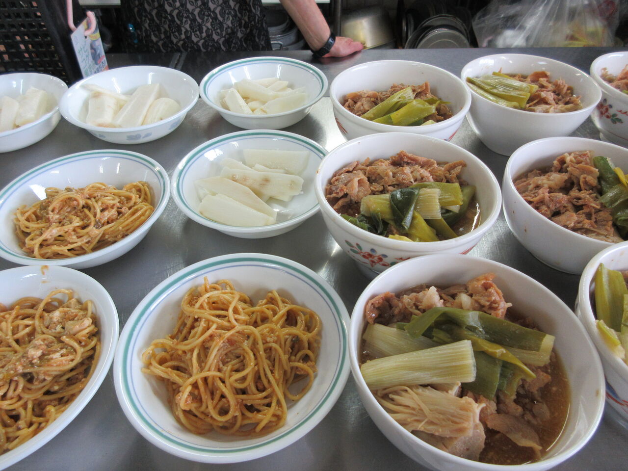 今日のカウンター上です。右には煮物のお代わり用が加温プレートで温められています。左には長芋が追いカツオつゆと出ています。