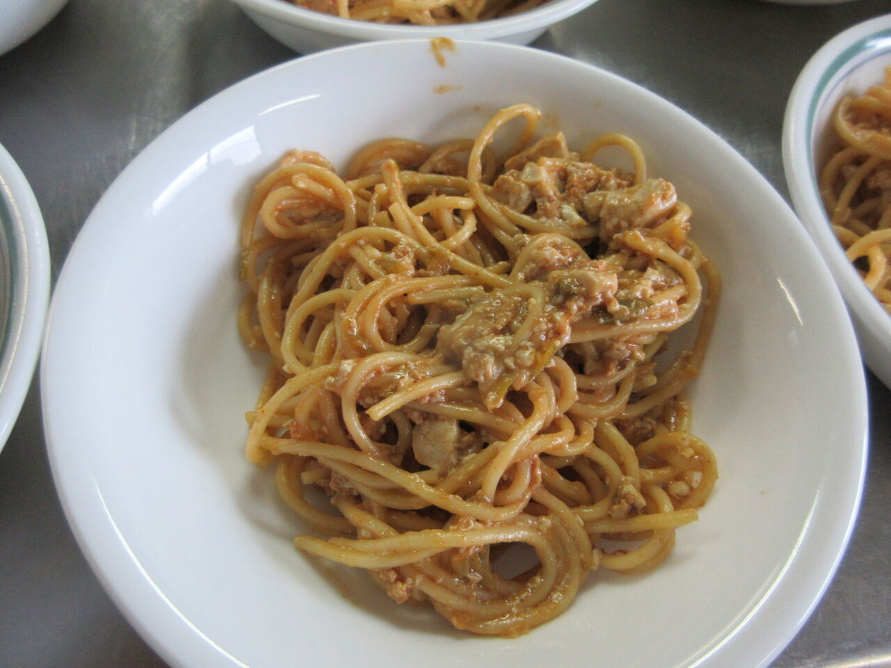 麻婆豆腐が少し余ったのでスパゲティーをゆでパスタソース代わりに使いました。少し味が足らなかったのでオイスターソースを追加しています。