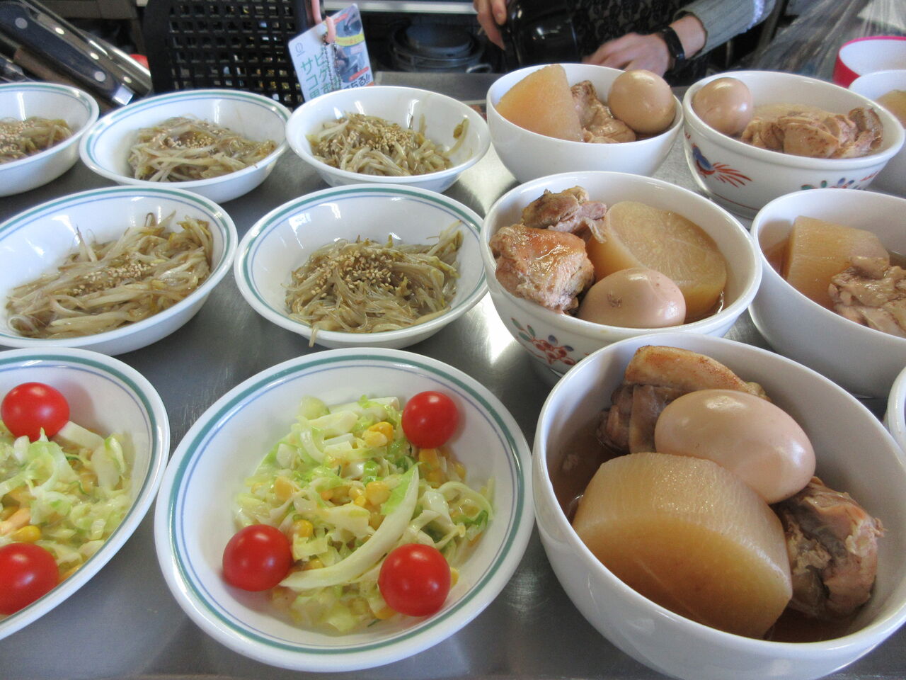 今日のカウンター上です。右には大根の煮物が加温プレートで温められています。左にはもやしです。