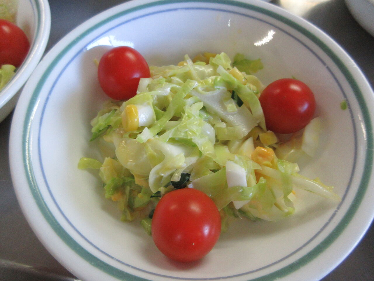 昨日の茹で卵のサラダを卵をスライスして混ぜ込み無マヨネーズで和えたサラダです。ミニトマト飾りました。