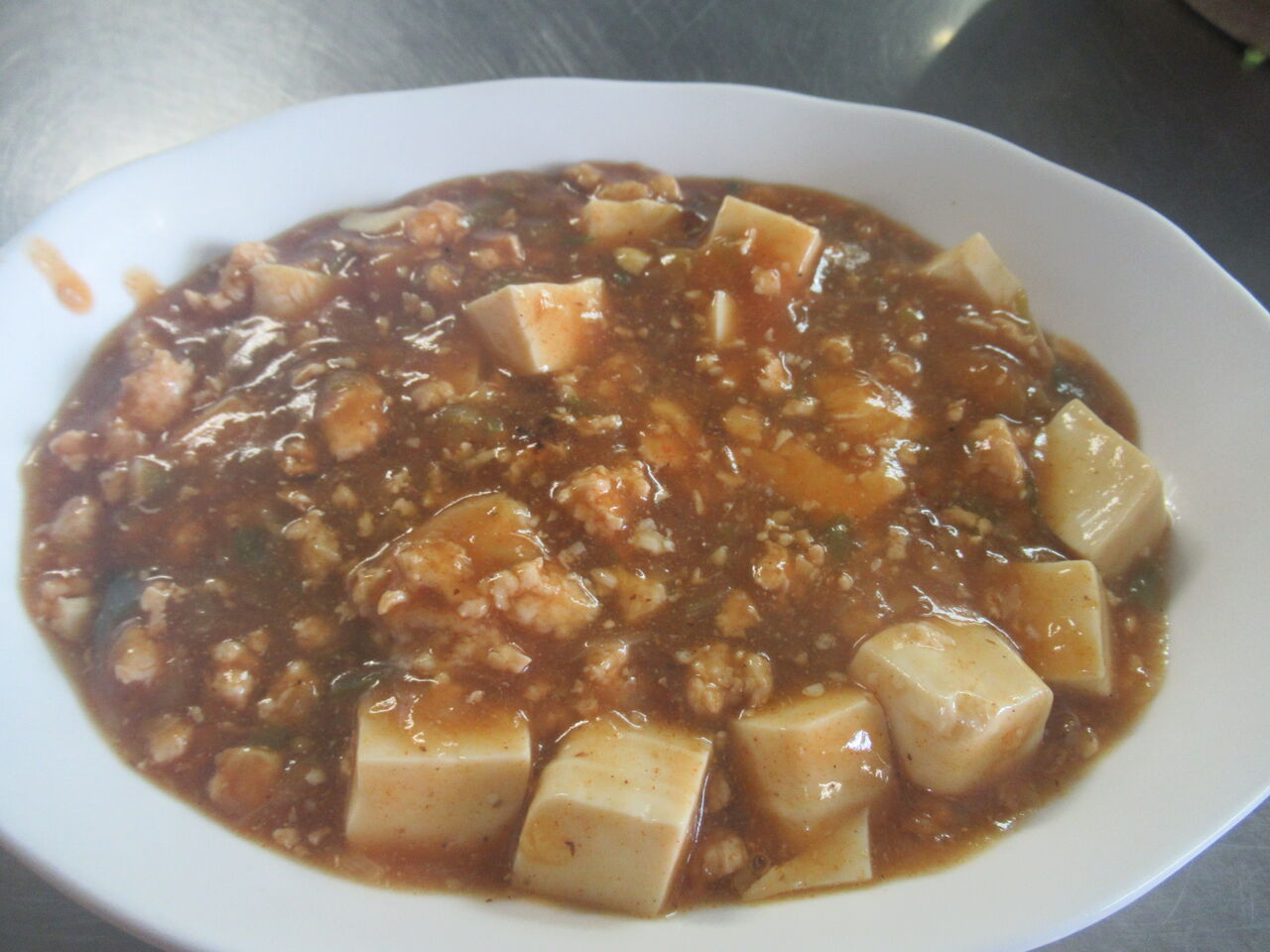 器によそっても熱々なのでレンズが曇ります。鶏ひき肉と長ネギ、生姜の麻婆豆腐です。味付けは砂糖、赤だしみそ、豆板醤、コチジャン、山椒、かつおだし、オイスターソースなどです。