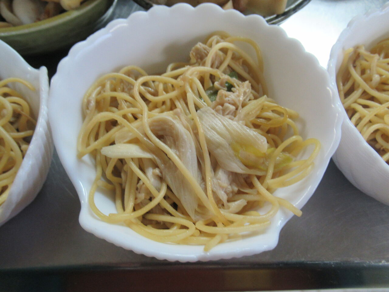 極細のスパゲティで和風スパを作りました。エノキと長ネギが具でバター醤油味です。