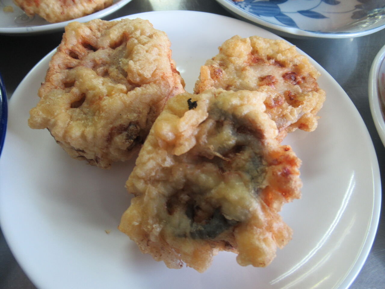 初めて作ったレンコンのはさみ揚げです。鶏ひき肉に長ネギと生姜、端っこの蓮根を微塵にして混ぜ、卵と塩でつないだ肉だねをはさみ天ぷら衣をくぐらせて揚げています。