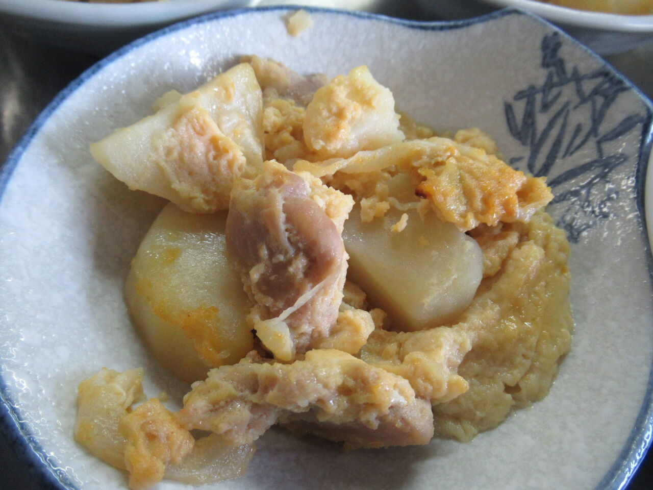 昨日の主菜のじゃがてもの卵とじをレンチンして副菜にリメイクしています。