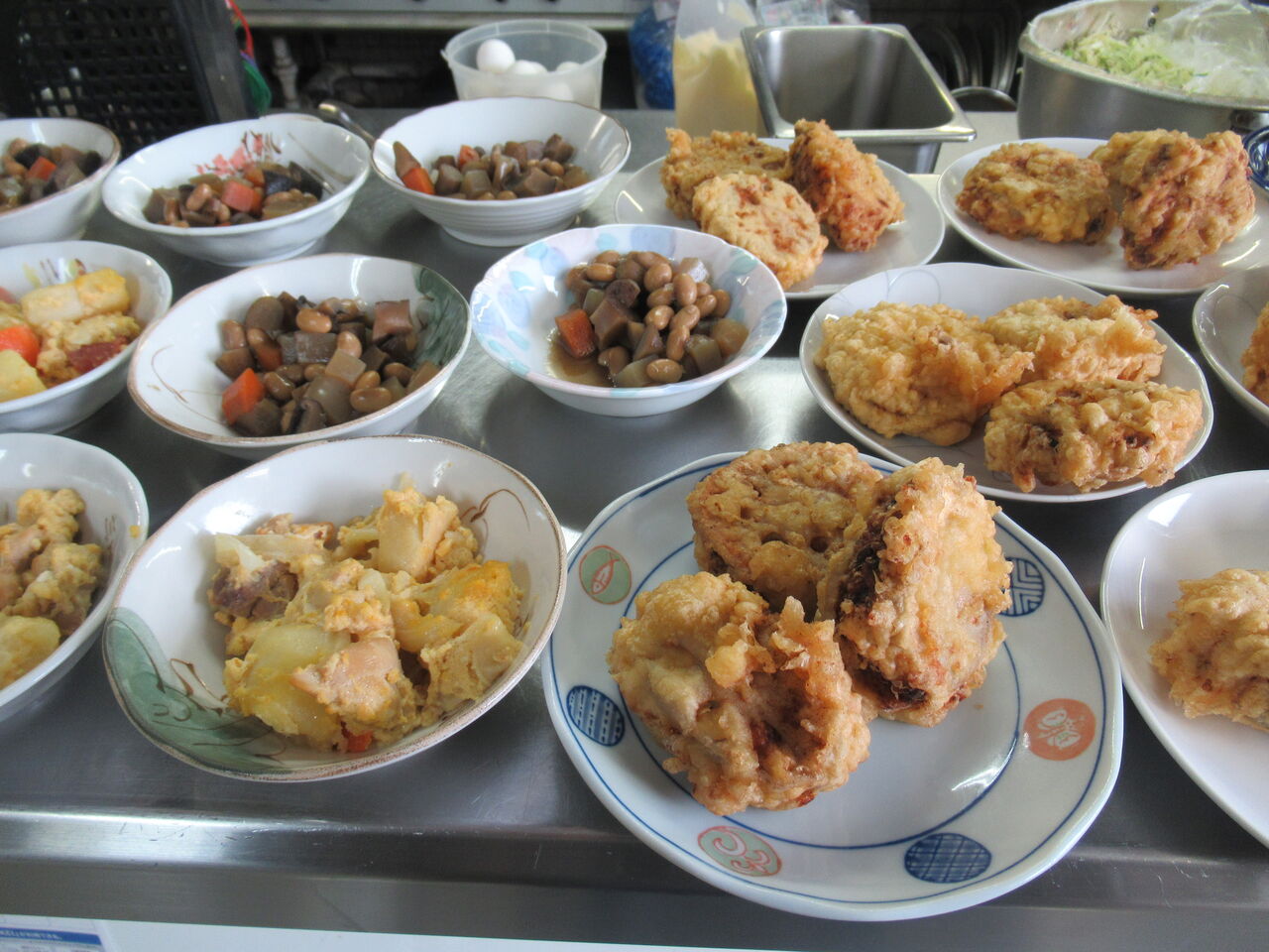 今日のカウンター上です。本当は揚げ物にレタスなりつけたいところですが在庫がなかったです。副菜のキャベツのサラダでも食べていただければよいかと思います。