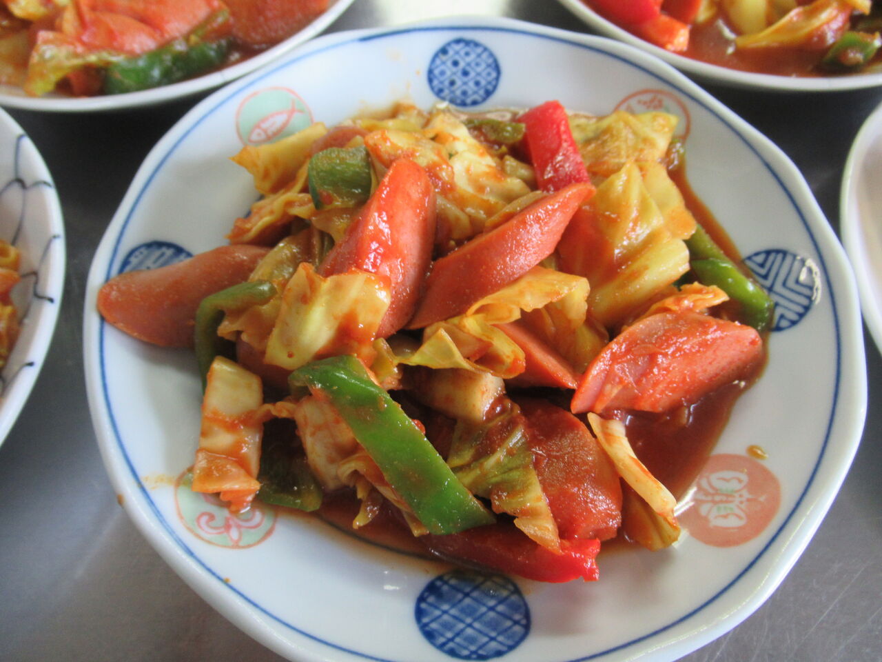 ソーセージのカリーブルスト風はソーセージとキャベツ、ピーマンを炒めてケチャップとカレー粉で味付けしてあります。