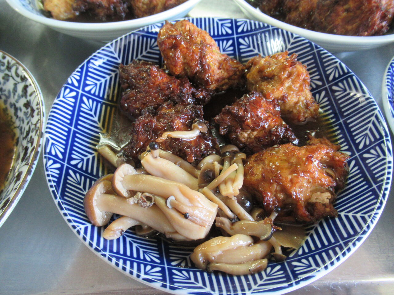 鶏ひき肉に刻んだ長ネギを混ぜ込み揚げてつくねを作りました。濃い目のたれで煮込みしめじも煮付けてとろみをつけました。キノコ嫌いの人には高野豆腐を煮合わせました。