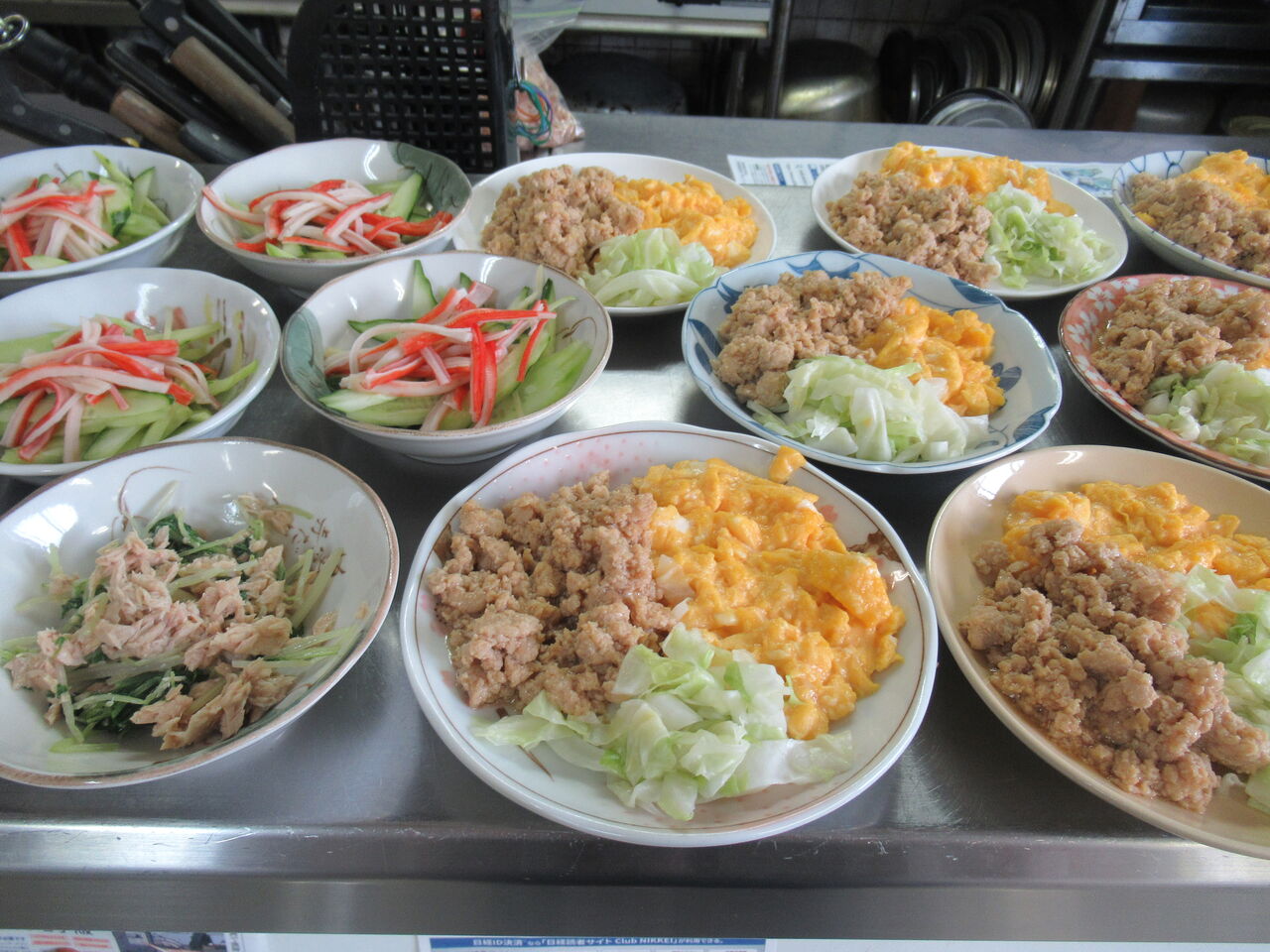 6月28日金曜日、今日のお昼御飯です。主菜は「3点盛り」副菜は4種類の中から選んでもらいます。「水菜のツナ和え」「ほうれん草のおひたし」「胡瓜とカニ足」「ズッキーニとピーマンのツナ炒め」です。汁物は「長ネギとジャガイモの味噌汁」になりました。