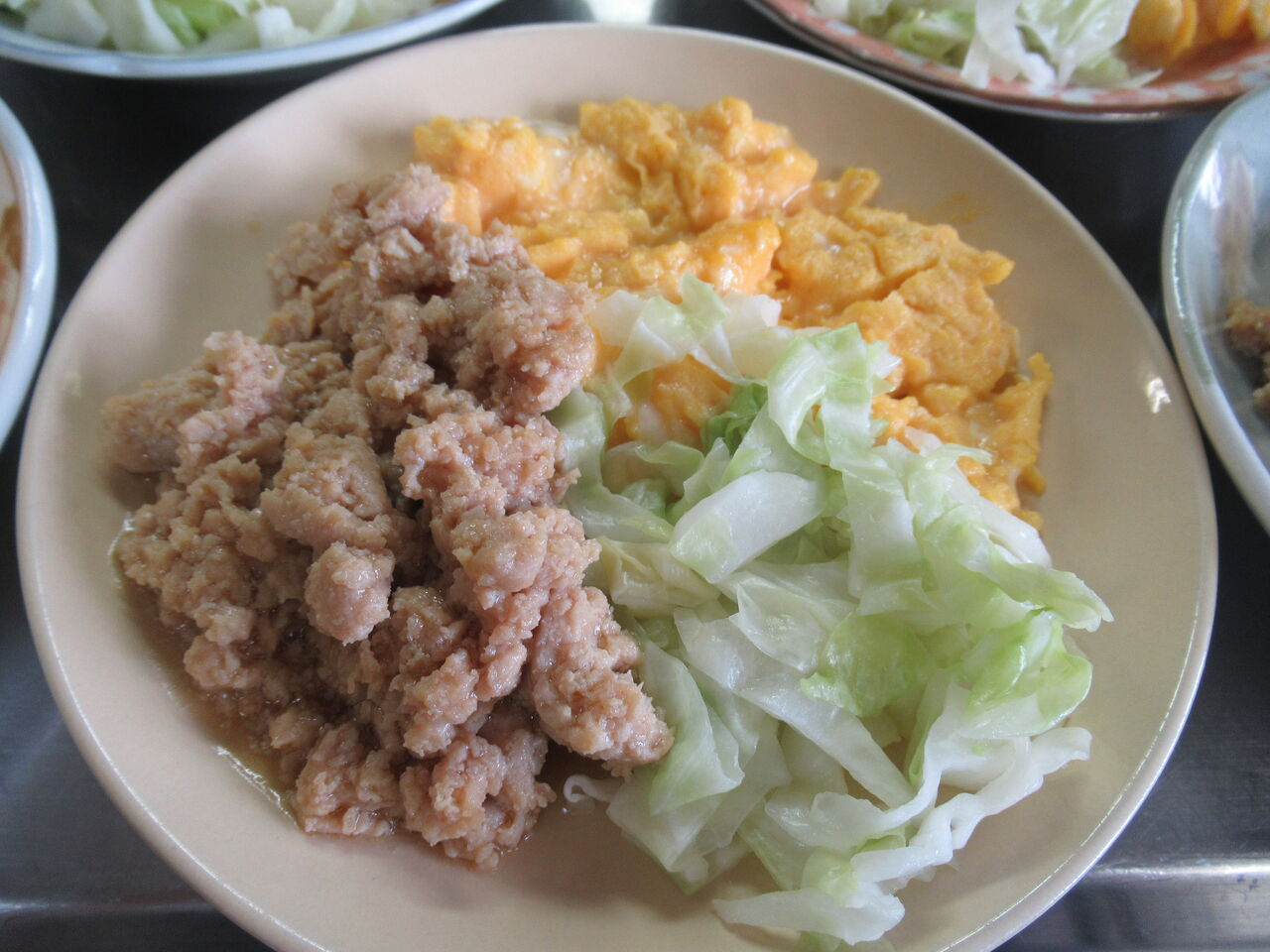 3点盛りはバターと塩で炒めたキャベツとその染み出た汁を混ぜ込んだスクランブルエッグ、きんぴら風に味付けした鶏ひき肉を盛り合わせてあります。