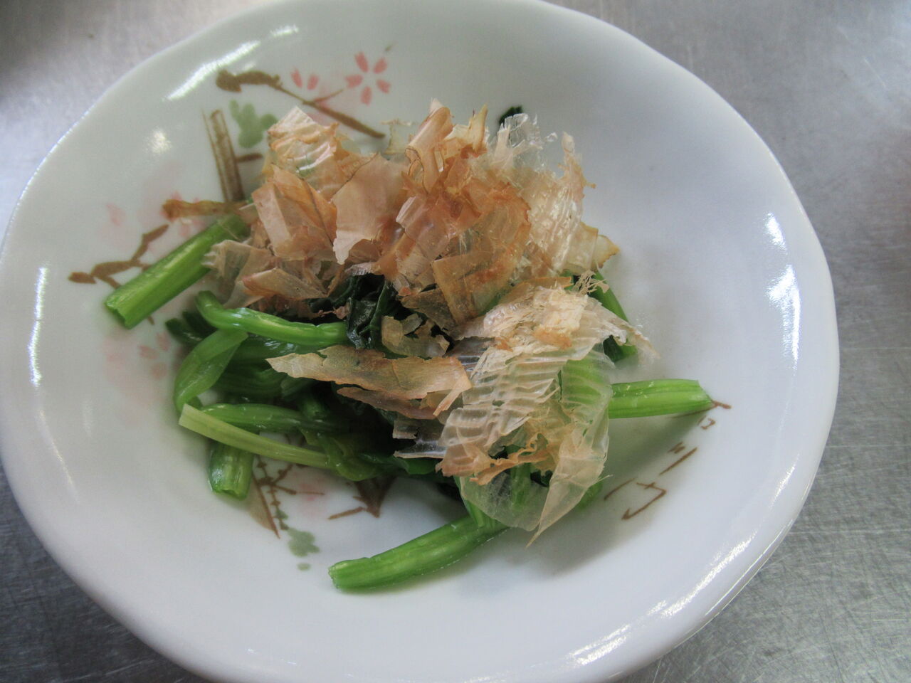 渡されたほうれん草をきれいにしてゆで。花かつおかけています。