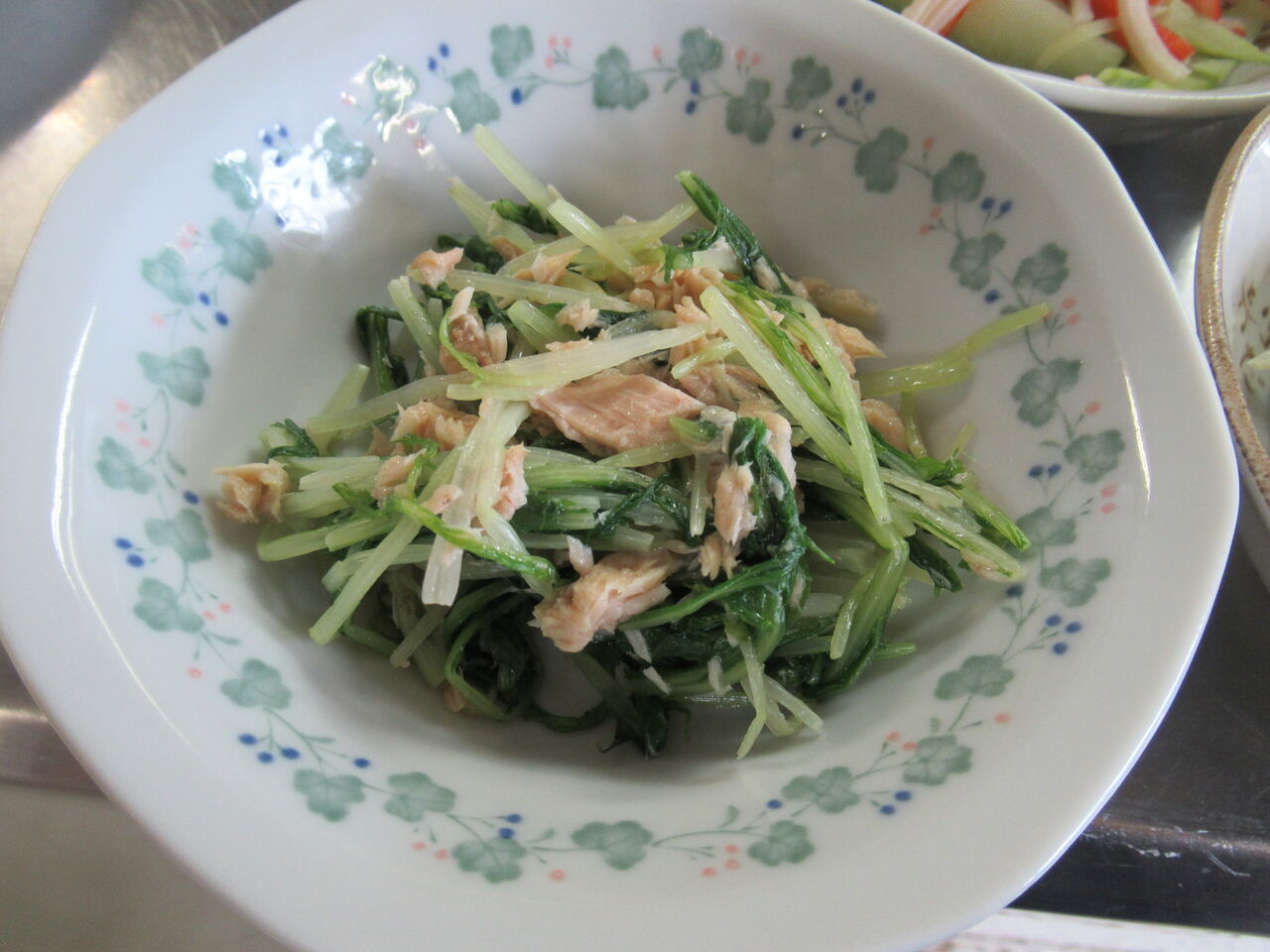 水菜のおひたしにツナを混ぜ込んでいます。