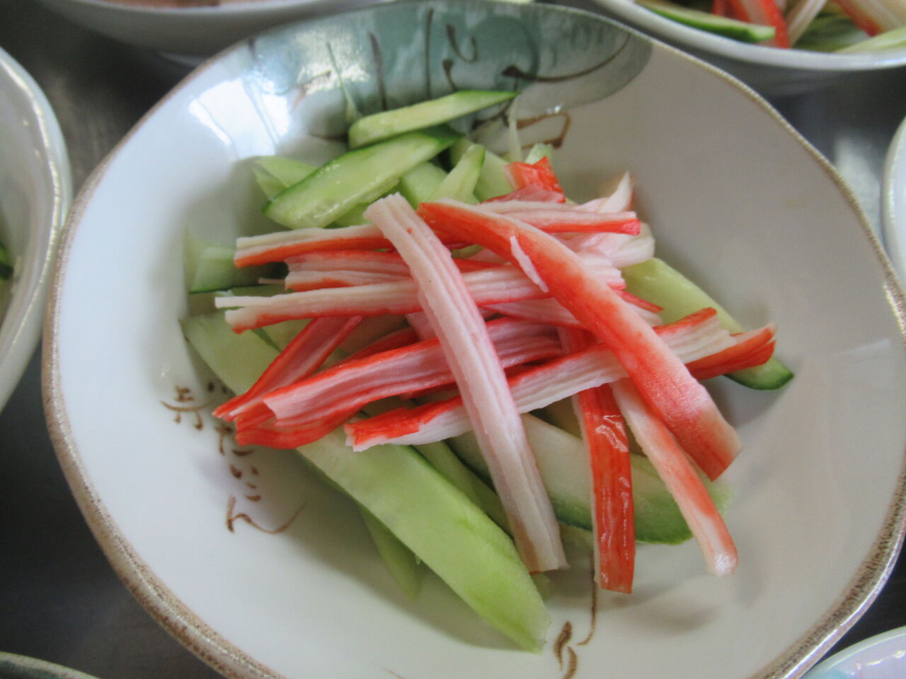 笹うち切りにした胡瓜に千切りショウガをまぶして盛り付けカニ足かまぼこを裂いてのせています。