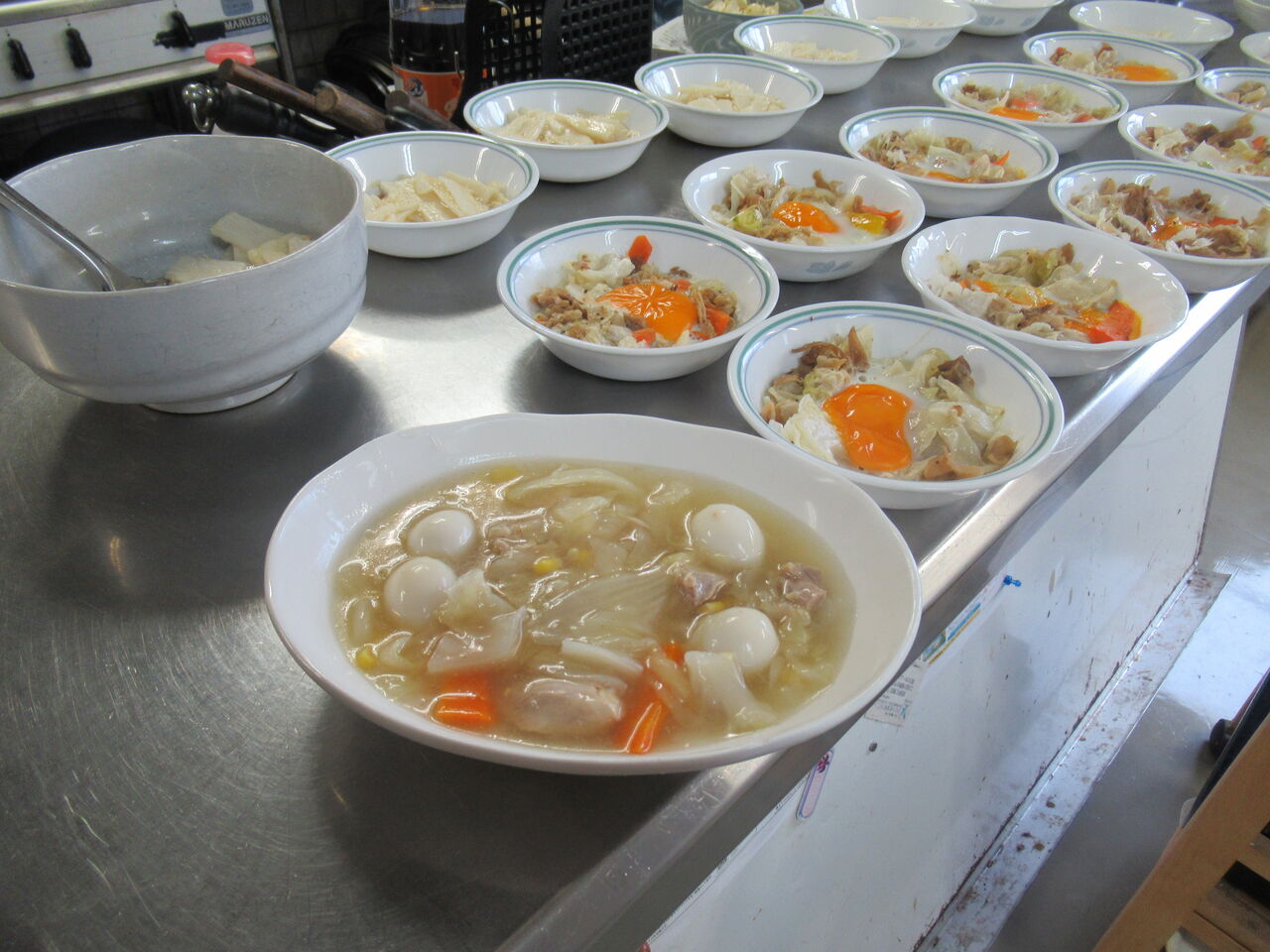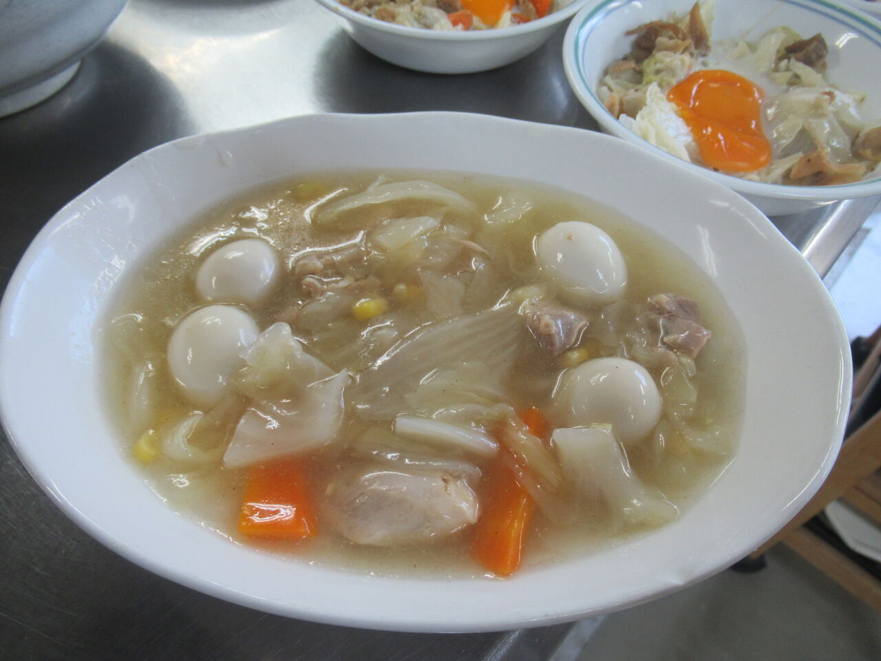 チャプスイは病院栄養士をしていた時に作っていたものです。玉ねぎとキャベツ、人参、コーン、鶏もも肉、ウズラ卵で作り味付けはかつおだしと塩です。本来はここにもやしが入るのですがキャベツと玉ねぎの在庫が巨大なので割愛しました。