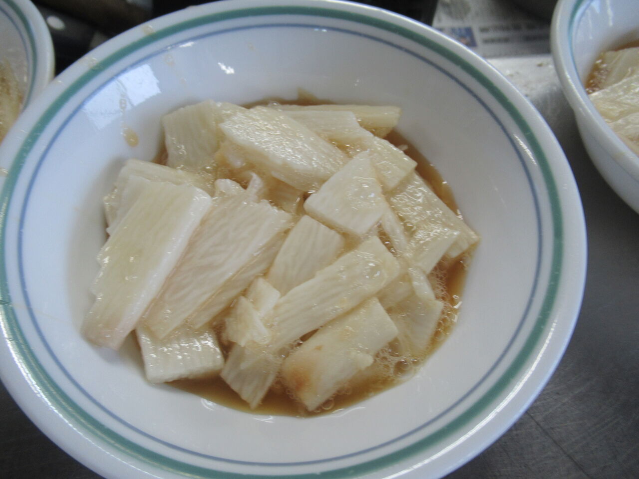 渡された長芋を短冊に切り、追いガツオつゆをかけています。