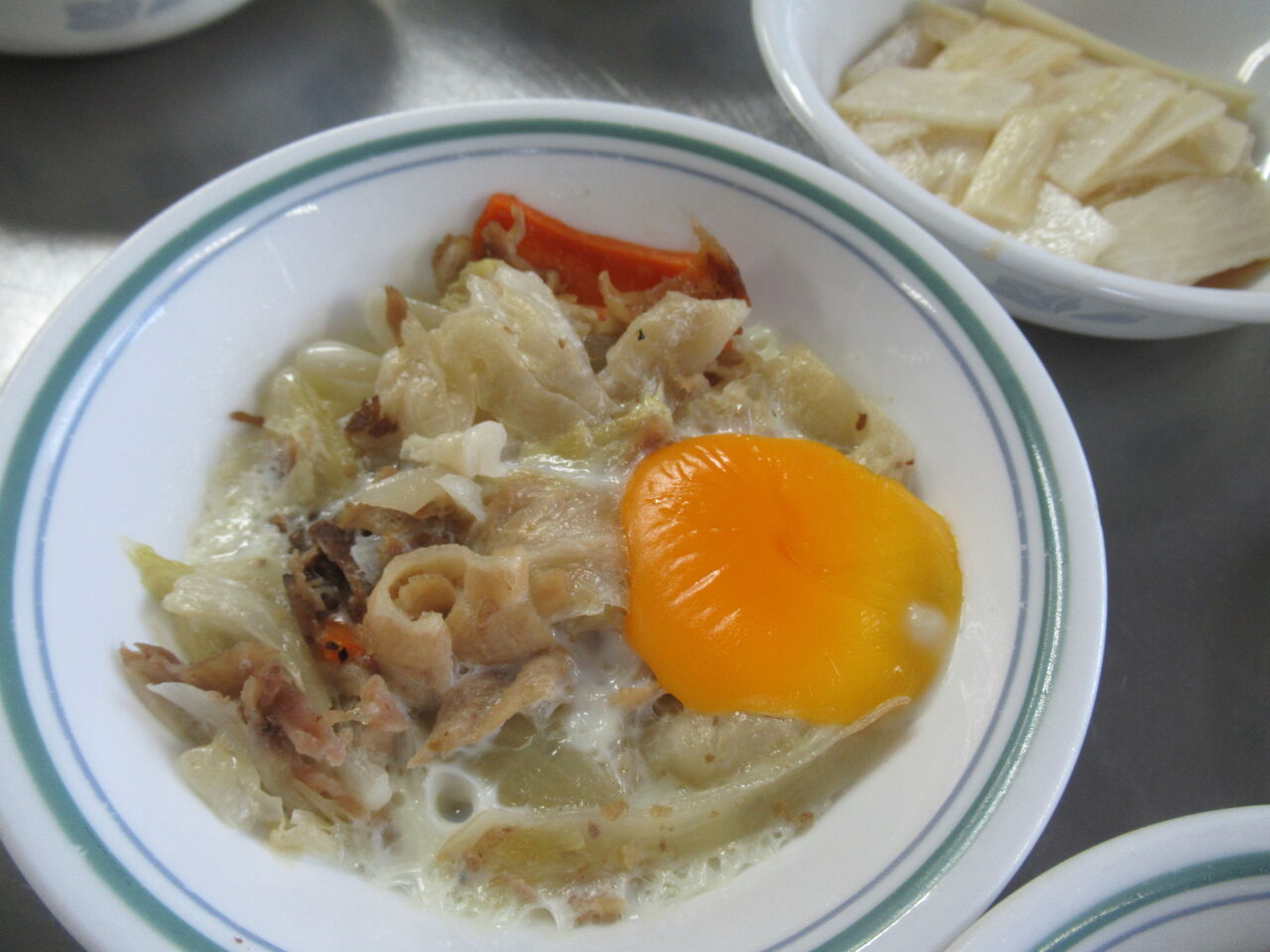 昨日の野菜炒めをレンチンした後器に盛り付け、卵を割り入れてさらにレンチンしています。