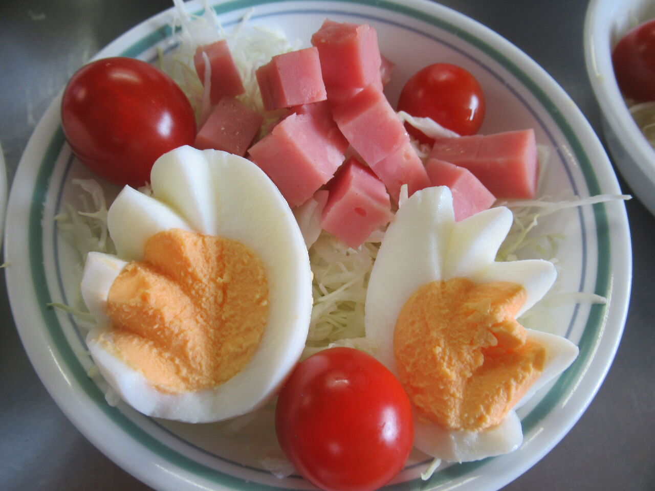 コールスローが5kgも渡されてしまったのでサラダにしました。千切りキャベツ、茹で卵、ハム、ミニトマトかオレンジをつけています。