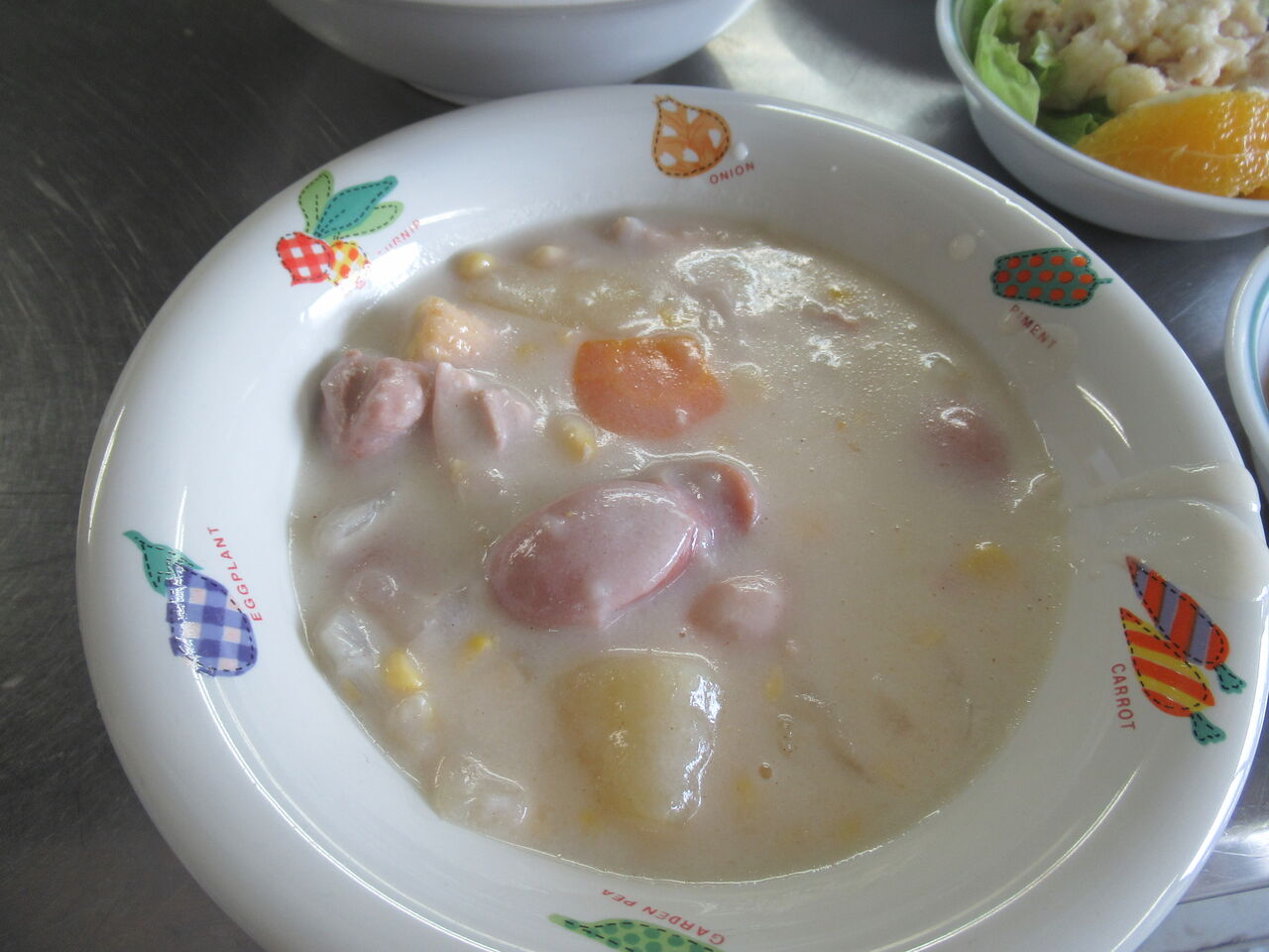 シチューはジャガイモ、玉ねぎ、人参、コーン、ソーセージ、鶏もも肉で作っています。ダイエットの人には焼き魚を用意しました。