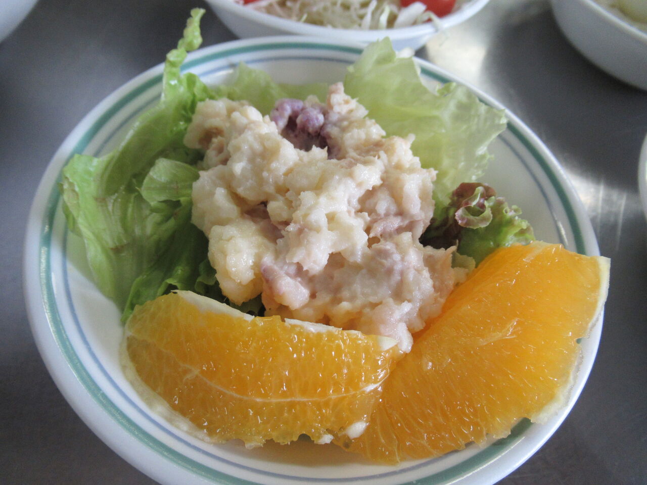 レタスを敷きポテトサラダとオレンジをのせています。