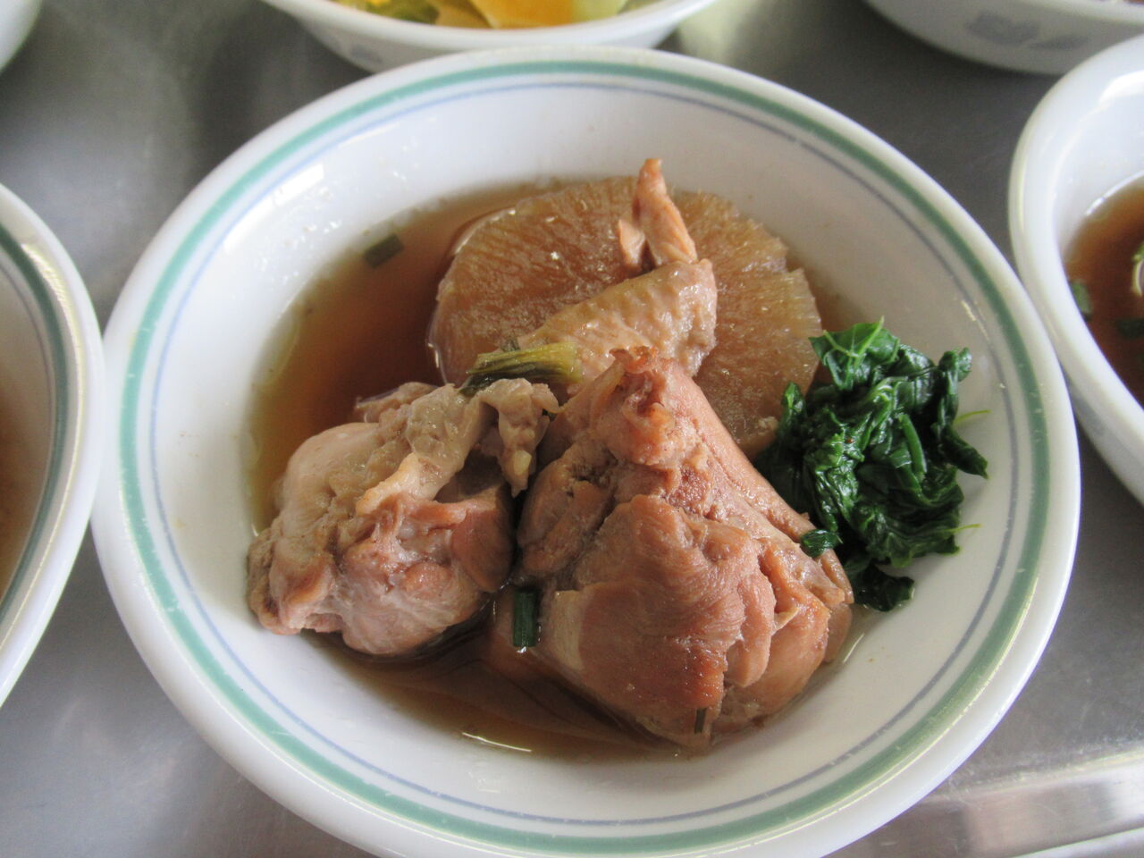 鶏大根が余っていたので副菜にしました。茹でた蕪の葉を添えています。