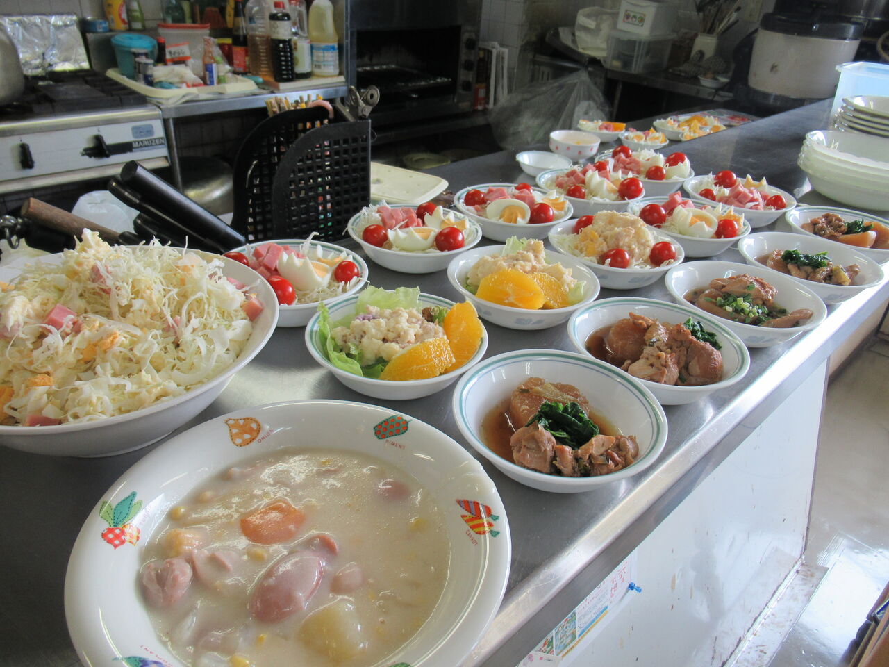 今日のカウンター上です。シチューは加温プレートで温めています。副菜のお代わり用はマヨネーズで和えたキャベツとハムと茹で卵です。