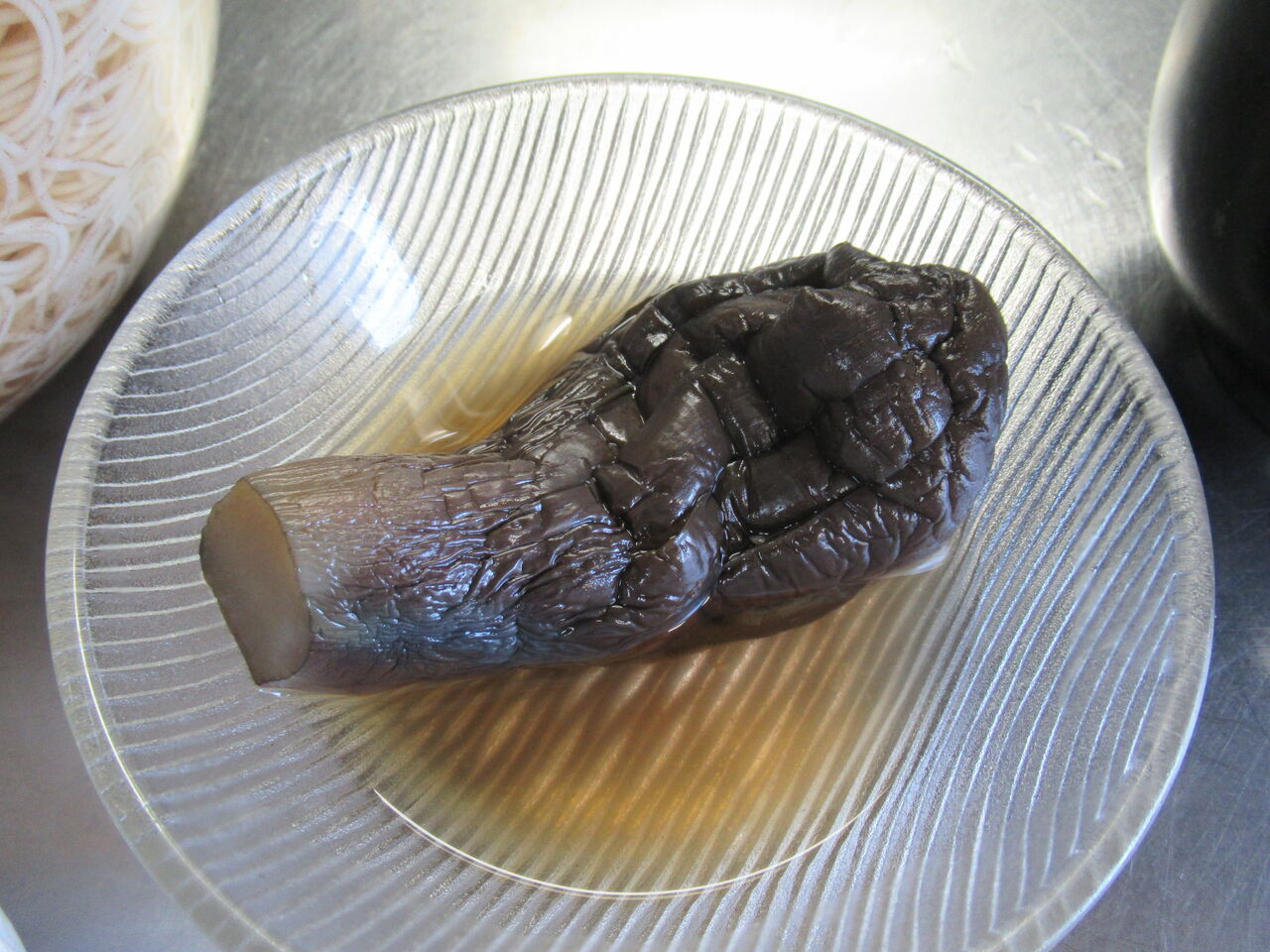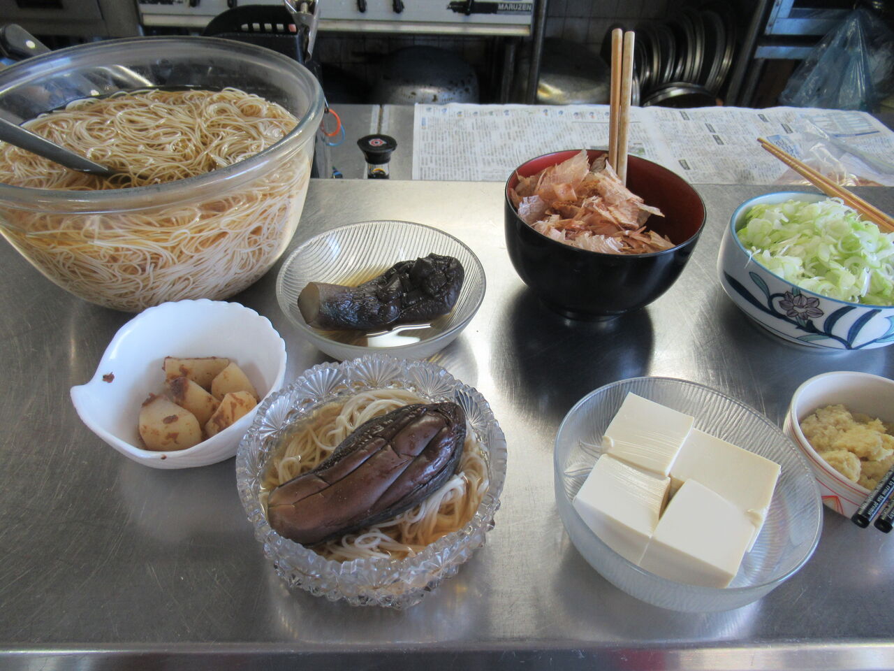 郷土料理のナスそうめんの冷たいバージョンです。お代わり用の鉢にはナスそうめんの煮汁を氷らせたものが浮いています。