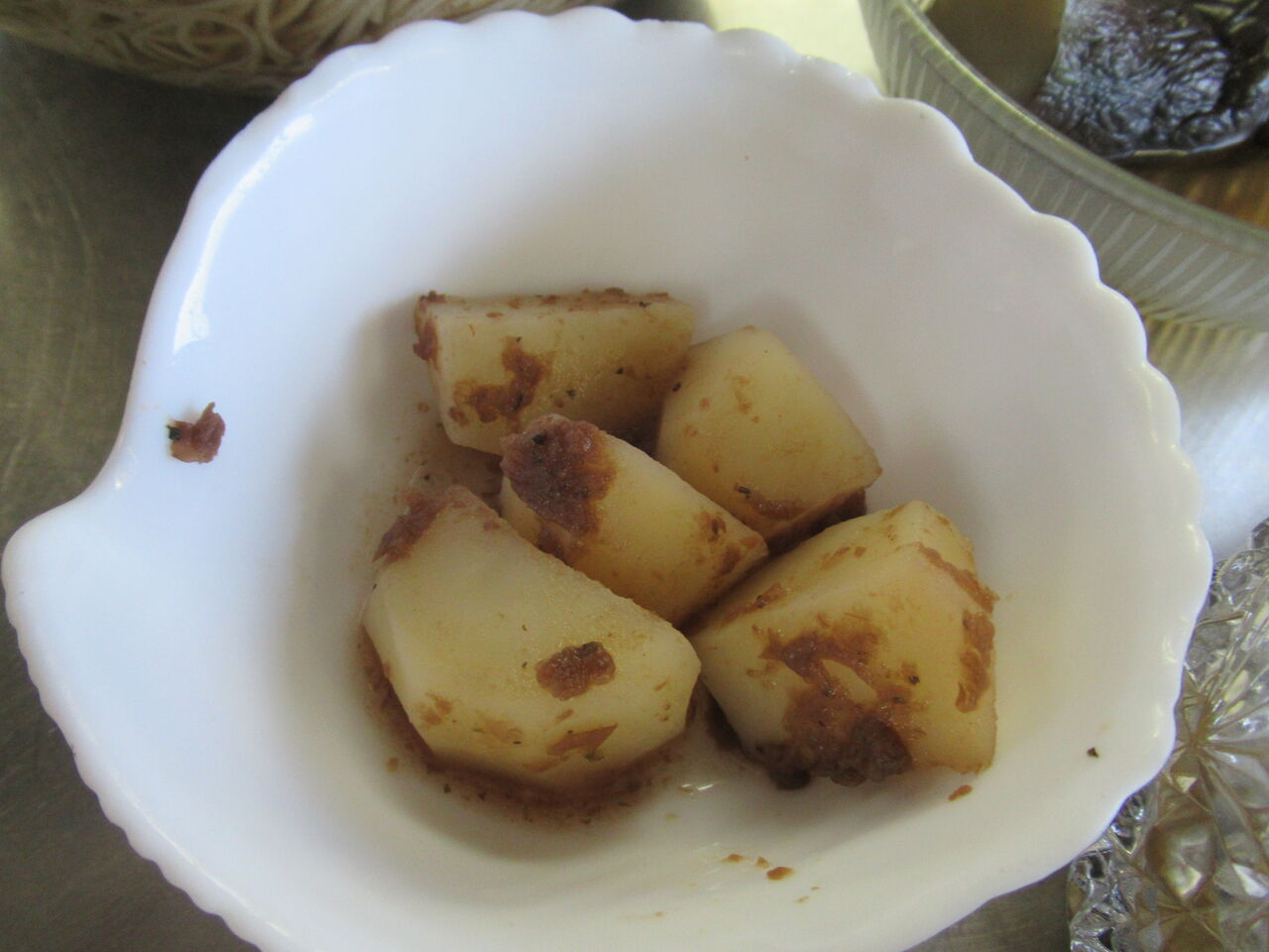 ナス嫌いの人にはジャガイモの梅香和えを用意しました。
