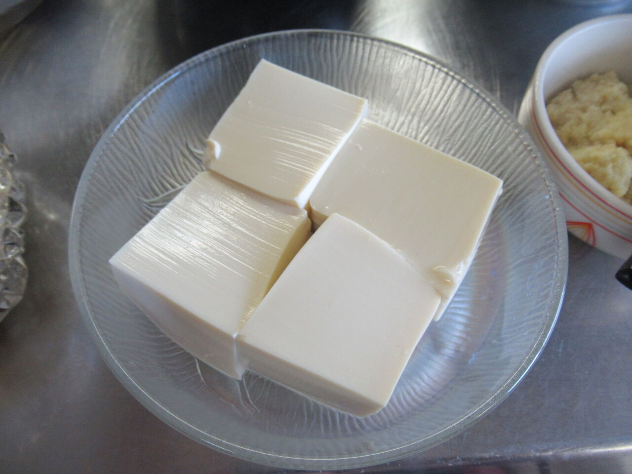 冷ややっこは1人分2/3丁です。おろし生姜、刻みネギ、花かつおを薬味として出してあります。