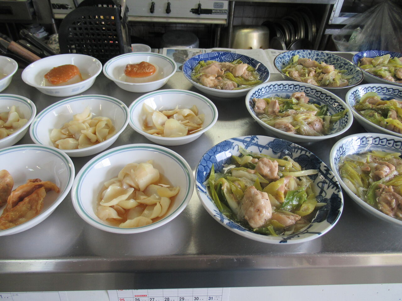 今日のカウンター上です。右には炒め物のお代わり用が、左には大根と味噌が別で出してあります。