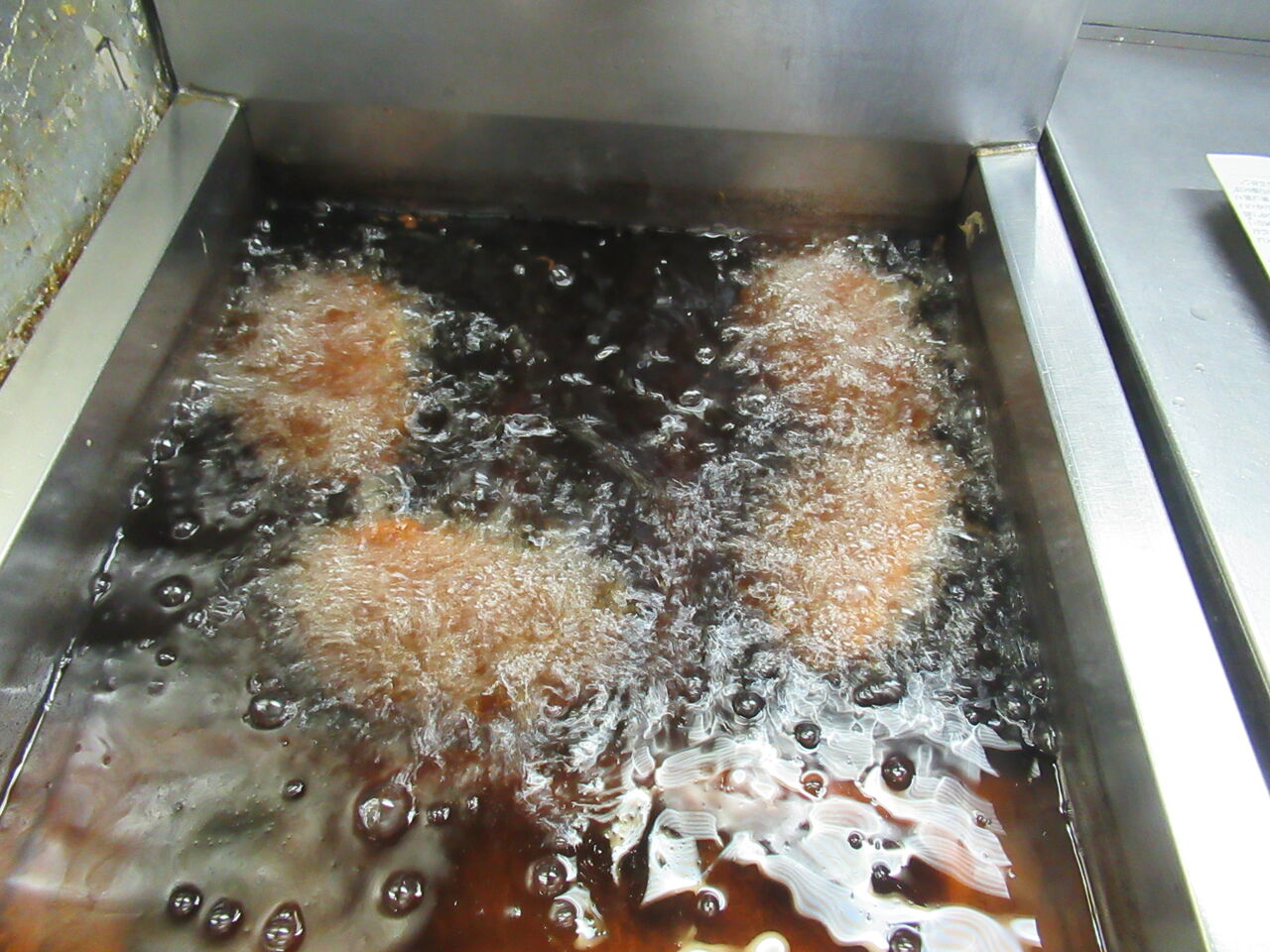 トンカツは一斗缶の油(16.5kg)入るフライヤーで揚げています。長年使っていますが不具合なしです。